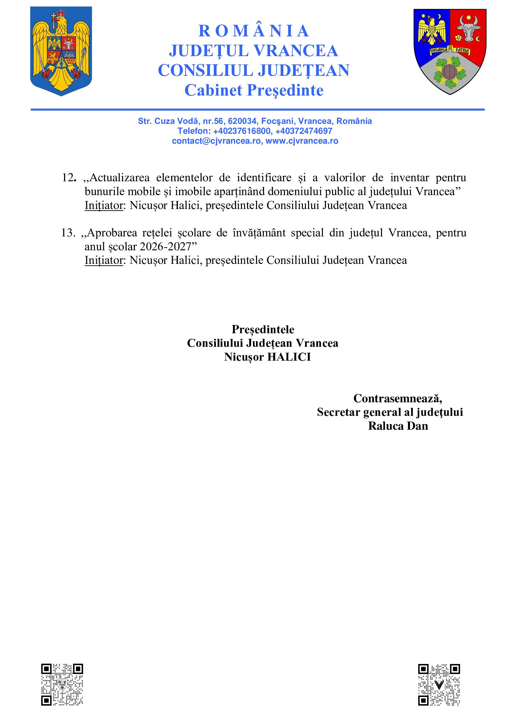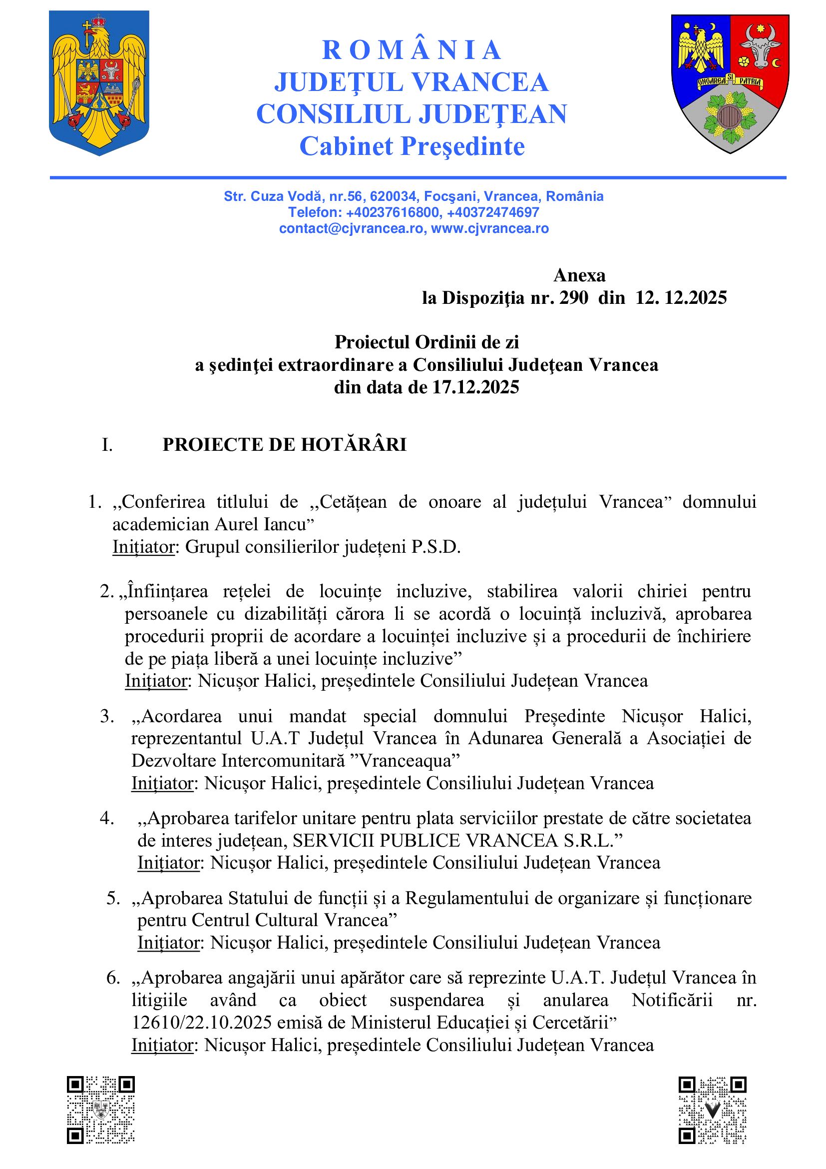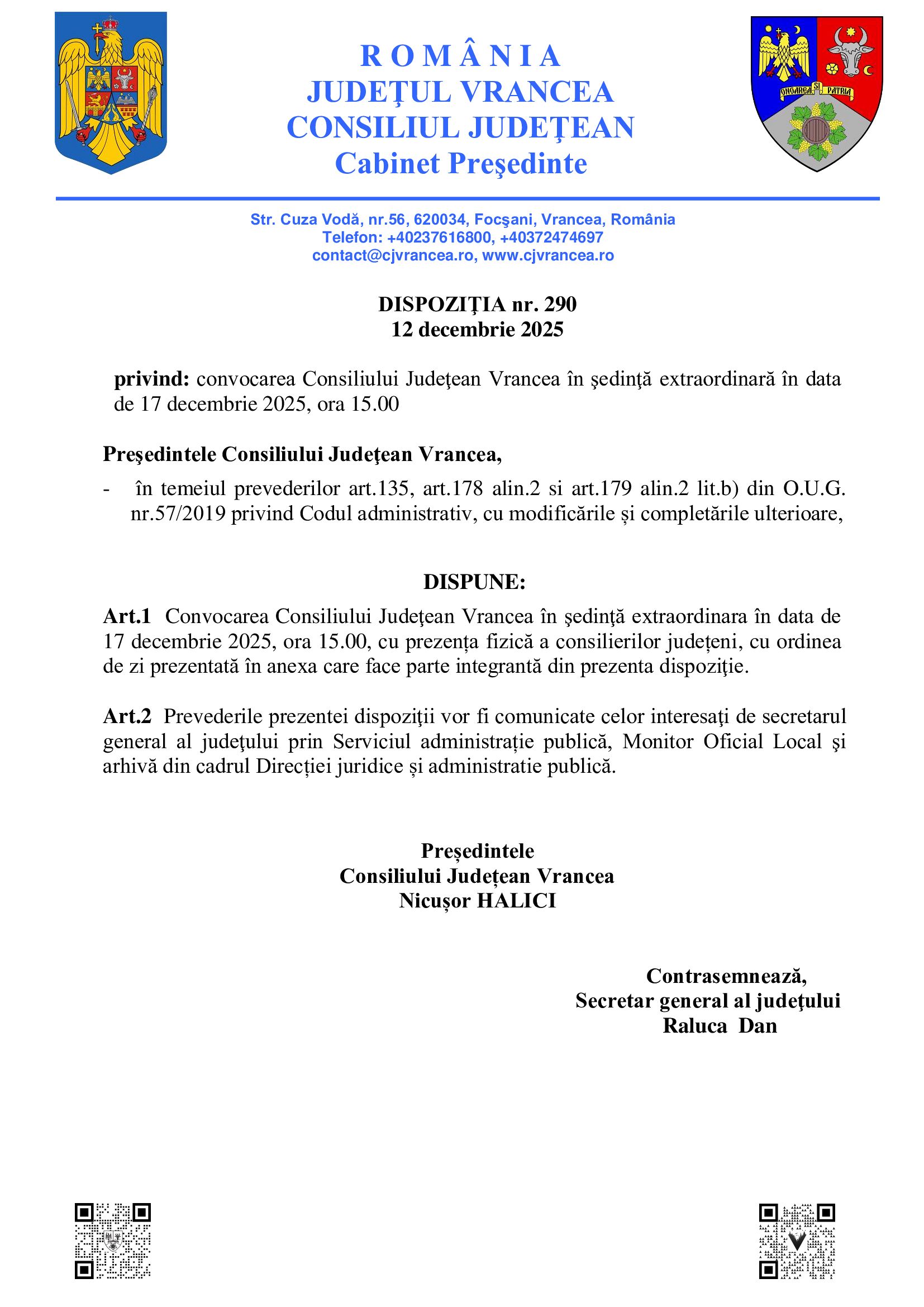 Convocarea este stabilită prin Dispoziția nr. 290 din 12 decembrie 2025, semnată de președintele Consiliului Județean Vrancea, Nicușor Halici, și contrasemnată de secretarul general al județului, Raluca Dan. Documentul prevede convocarea consilierilor județeni în ședință extraordinară, cu o ordine de zi ce cuprinde proiecte de hotărâre cu impact direct asupra comunităților din județ.