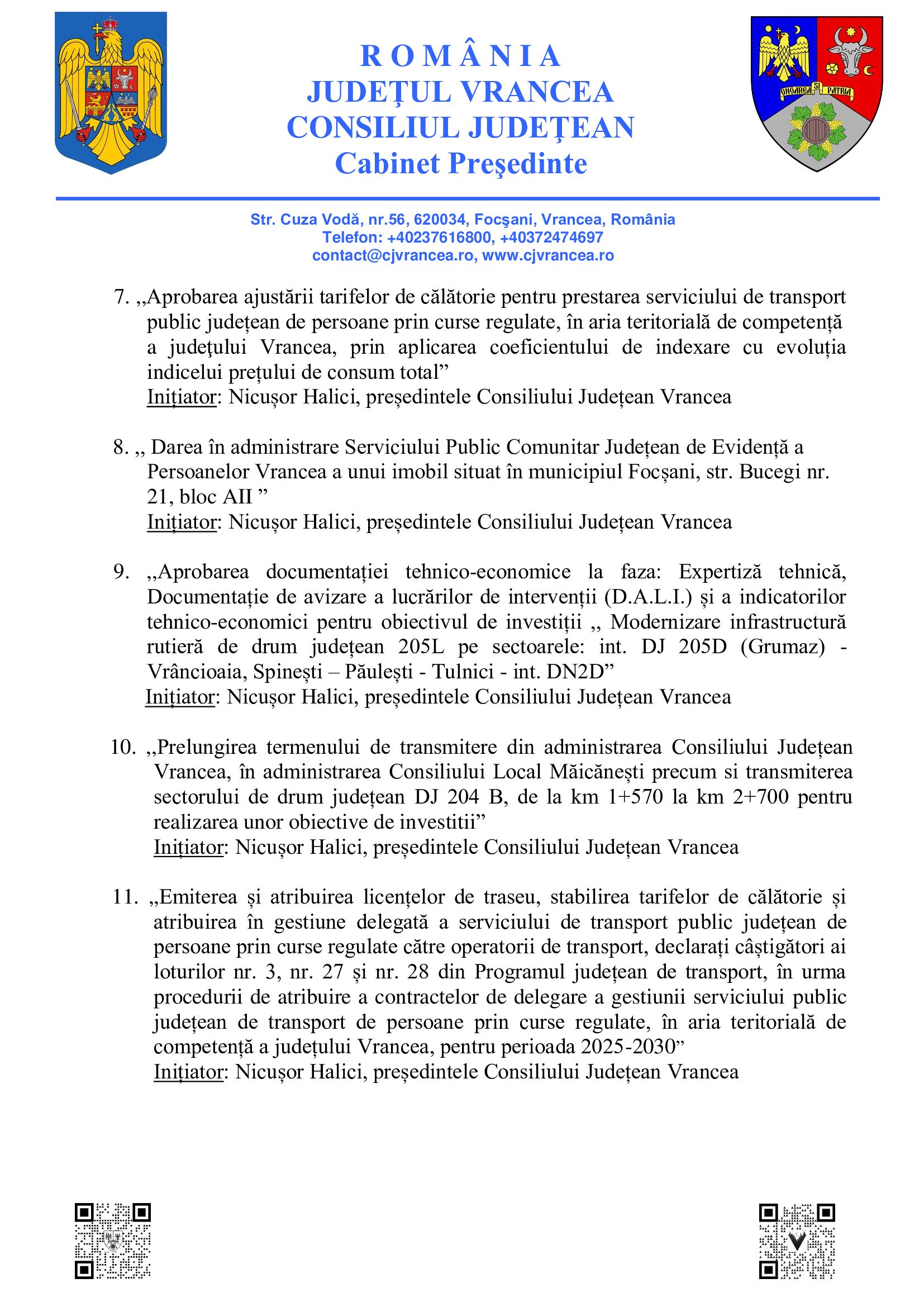 Cuvinte-cheie SEO (integrate natural): Consiliul Județean Vrancea, ședință extraordinară CJ Vrancea, Focșani, Nicușor Halici, Cetățean de onoare al județului Vrancea, Aurel Iancu, DJ 205L, transport public județean Vrancea, locuințe incluzive, Centrul Cultural Vrancea, ADI Vranceaqua.