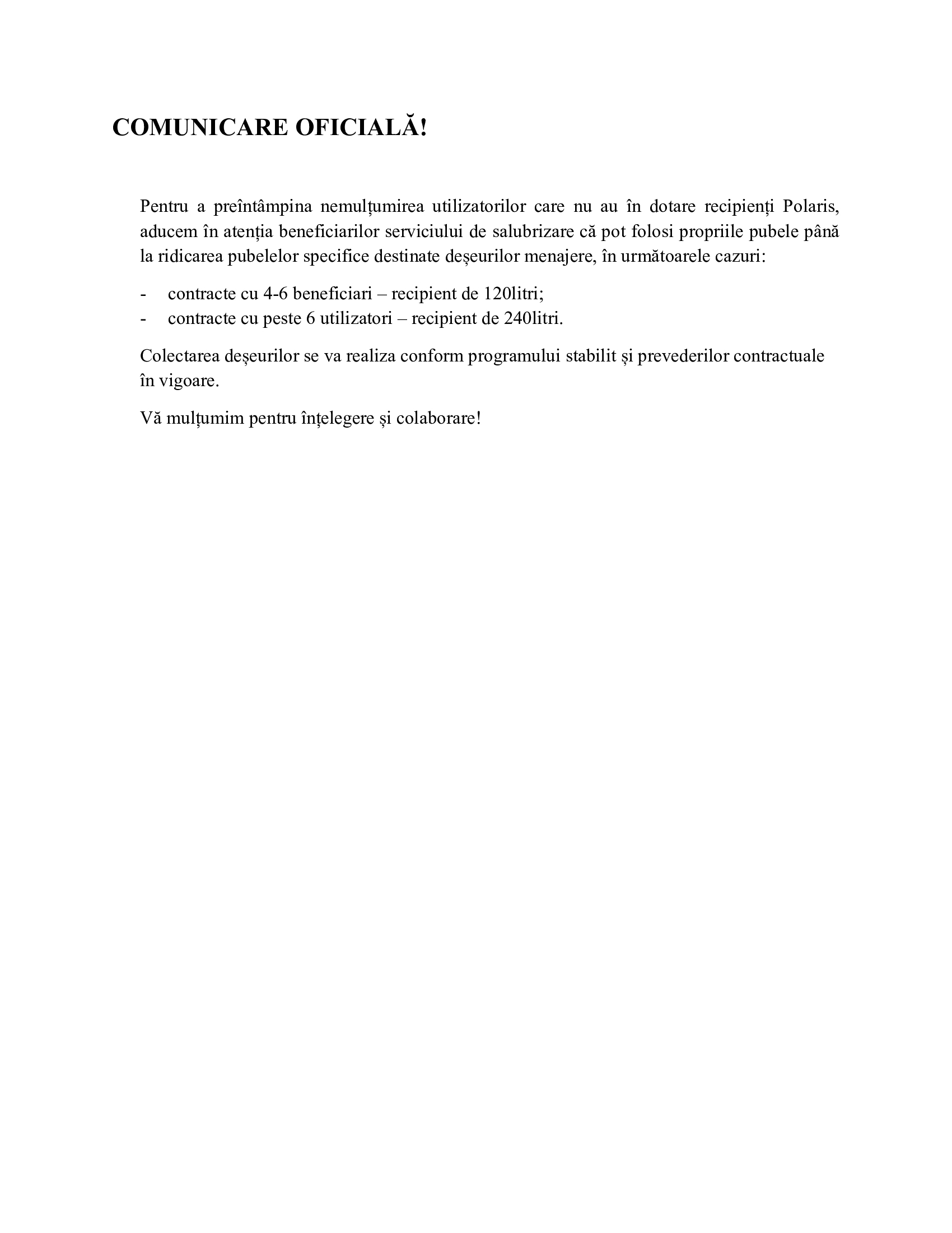Pentru a preîntâmpina disconfortul beneficiarilor care nu au primit încă pubelele specifice, Polaris M. Holding anunță că va permite temporar utilizarea propriilor recipienți, cu respectarea unor condiții clare, stabilite în funcție de numărul de persoane din contract.