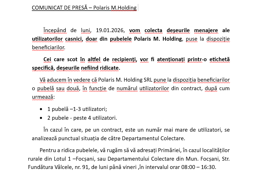 Începând de luni, 19 ianuarie 2026, modul de colectare a deșeurilor menajere se modifică în județul Vrancea, potrivit unui comunicat de presă transmis vineri, 16 ianuarie 2026, redacției Ziarului de Vrancea de către S.C. POLARIS M. HOLDING S.R.L. Operatorul de salubritate anunță că vor fi ridicate exclusiv deșeurile depozitate în pubelele Polaris M. Holding, puse la dispoziție beneficiarilor casnici.