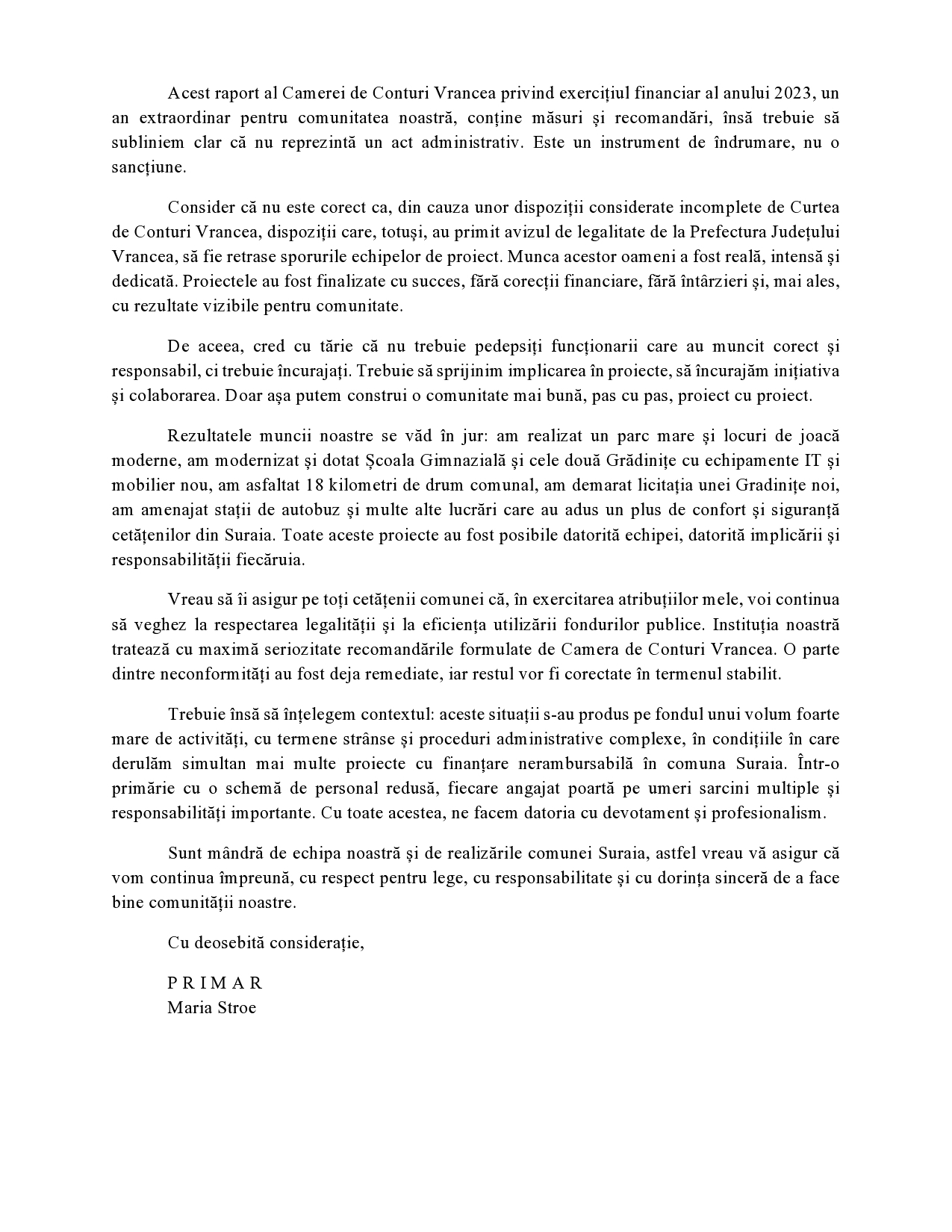 Citiți în documentul atașat conținutul integral al Raportului de audit financiar asupra situațiilor financiare centralizate ale Unității Administrativ-Teritoriale Comuna Suraia la data de 31.12.2023 întocmit de Camera de Conturi Vrancea avînd nr 69458/ 13.10.2025