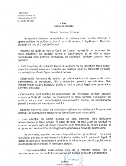 Punctul de vedere al Primăriei Păunești, transmis către Ziarul de Vrancea