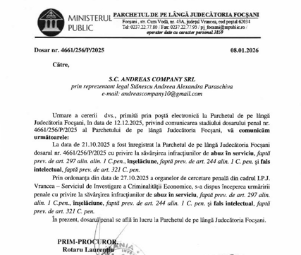 Din documentele oficiale intrate în posesia redacției rezultă că dosarul penal este înregistrat și se află în lucru la Parchetul de pe lângă Judecătoria Focșani, fiind vizate infracțiuni precum abuz în serviciu, înșelăciune și fals intelectual, cercetările fiind desfășurate de organele abilitate.