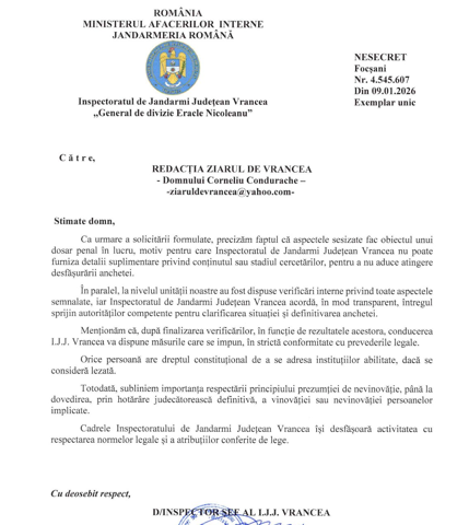 Pentru a respecta principiile transparenței și informării corecte, Ziarul de Vrancea a solicitat în aceeași zi, 5 ianuarie 2026, ora 18:46, un punct de vedere oficial Inspectoratului de Jandarmi Județean Vrancea, prin purtătorul de cuvânt, adresându-se conducerii unității.