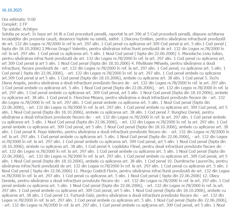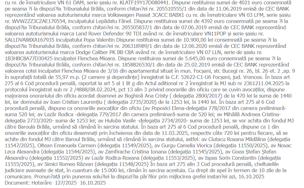 În minuta pronunțată în ședința de joi, 16 octombrie 2025 (Complet 2 FP), Tribunalul Brăila a consemnat, pentru fiecare inculpat, achitare pentru faptele imputate, apreciind că elementele constitutive ale infracțiunilor nu sunt întrunite. Instanța a dispus și ridicarea tuturor sechestrării asigurătorii și restituirea sumelor consemnate în contul valorii unor bunuri indisponibilizate pe durata procesului.