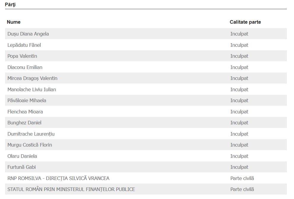 Din rândul membrilor Comisiei Județene pentru Stabilirea Dreptului de Proprietate Privată asupra Terenurilor Forestiere Vrancea( n.r din anul 2006), alături de un consilier juridic, au fost trimiși în judecată: Emilian Diaconu (ex director la Cadastru), Liviu-Iulian Manolache, Dragoș-Valentin Mircea (fost prefect), Costică-Florin Murgu, Laurențiu Dumitrache (fost şef al Direcţiei Silvice Vrancea), Mihaela Păvăloaie, Diana-Angela Dușu, Mioara Flenchea (fost subprefect), Daniel Bunghez (fost șef ADS Vrancea), Valentin Popa, Fănel Lepădatu, Daniela Olaru ( fost arhitect-șef al județului) și Gabi Furtună.