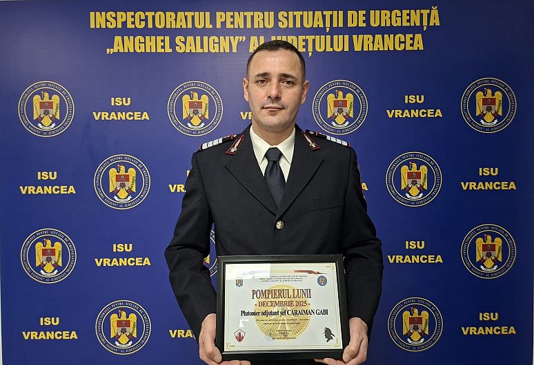 Inspectoratul pentru Situații de Urgență „Anghel Saligny” al județului Vrancea îl desemnează pe plutonierul adjutant șef Caraiman Gabi drept Pompierul lunii decembrie, în semn de apreciere pentru modul exemplar în care a acționat și a coordonat intervenția la explozia produsă pe 22 decembrie 2025, din cauza acumulării de gaze într-un imobil din cartierul Sud al municipiului Focșani.