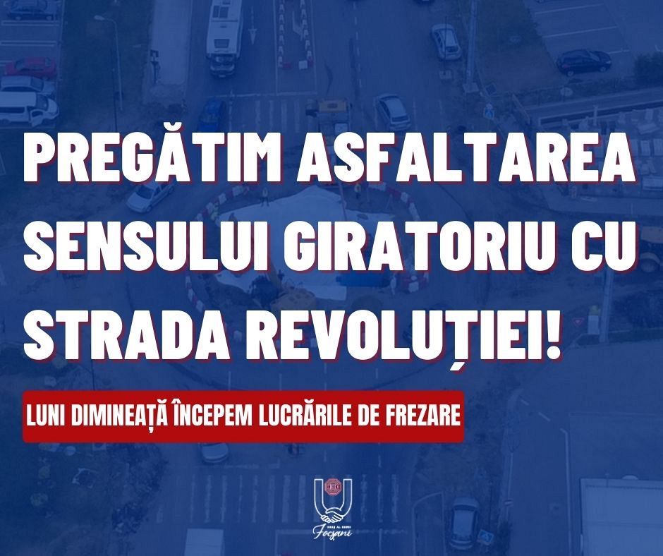 Administrația locală anunță demararea unor lucrări importante de infrastructură rutieră în municipiu. Potrivit unei informări publicate duminică, 1 martie 2026, la ora 16:45, pe pagina oficială de Facebook a Primăriei Municipiului Focșani, încep lucrările de pregătire pentru asfaltarea sensului giratoriu situat pe Șoseaua de Centură, la intersecția cu strada Revoluției.
