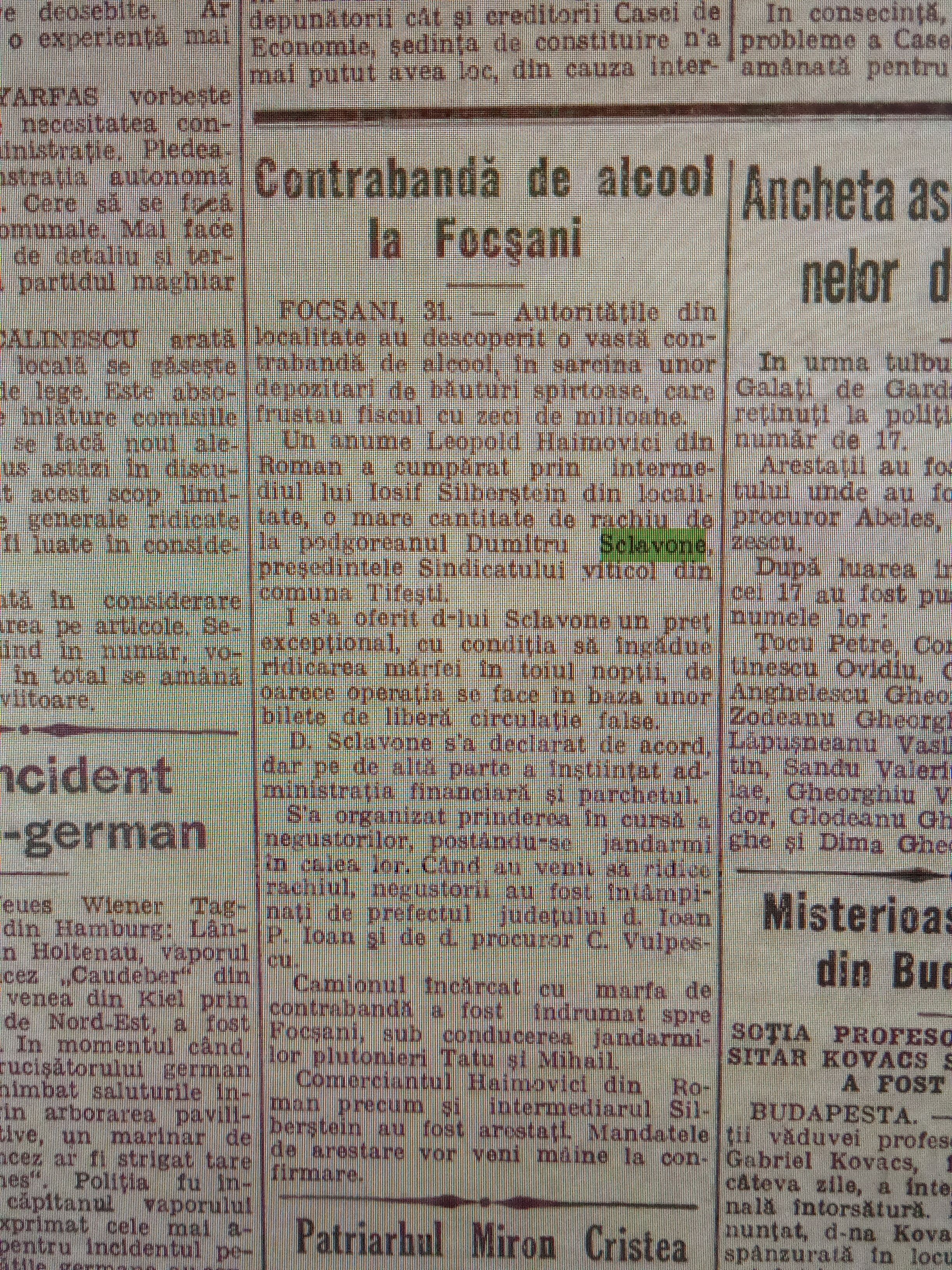 Si de aici începe povestea familiei Sclavone în acest edificiu de pe strada Cernei care azi se află în plină operațiune de reabilitare.Despre numele Sclavone putem afla, conform ziarelor vechi( Digi-buc -Adevărul ), că: „ în anul 1931 Dumitru Sclavone a fost implicat, într- un fel anume, într-o operațiune de contrabandă cu alcool” , despre care puteți citi alăturat.