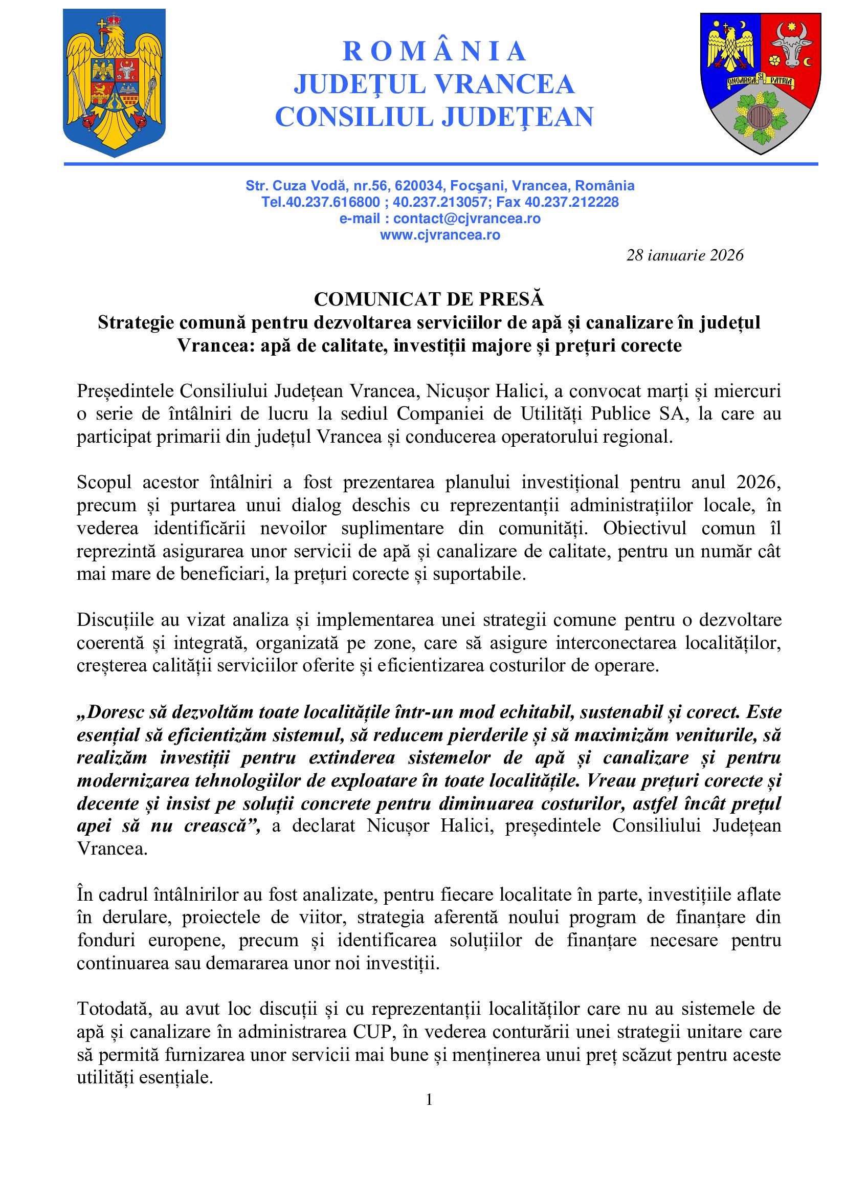 Conform informațiilor dintr-un comunicat de presă făcut public miercuri 28 ianuarie 2026 Vrancea face pași importanți spre modernizarea și extinderea serviciilor de apă și canalizare. Președintele Consiliul Județean Vrancea, Nicușor Halici, a convocat marți și miercuri, 27 și 28 ianuarie 2026 la sediul Compania de Utilități Publice SA, o serie de întâlniri de lucru cu primarii din județ și conducerea operatorului regional, în vederea stabilirii unei strategii comune pentru anul 2026.