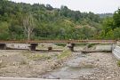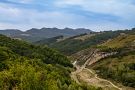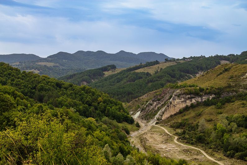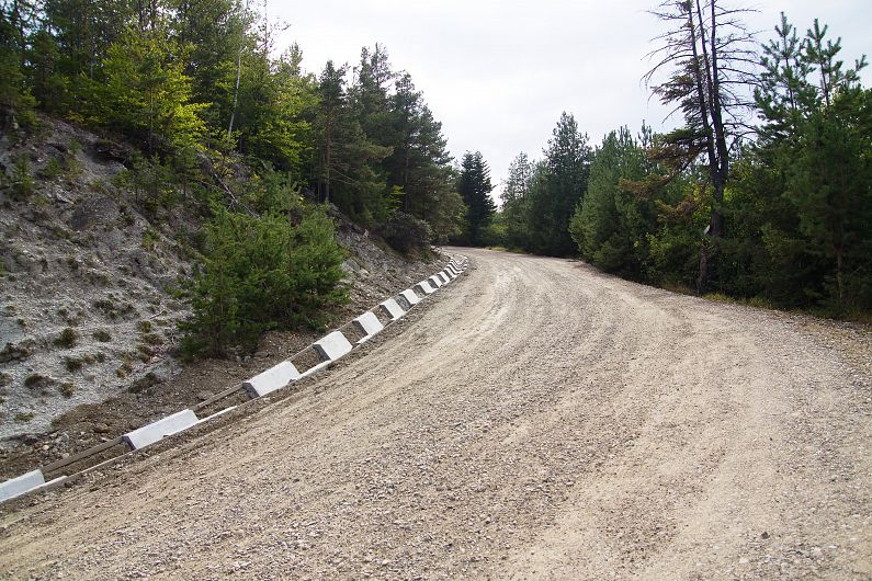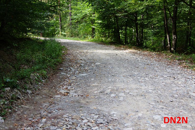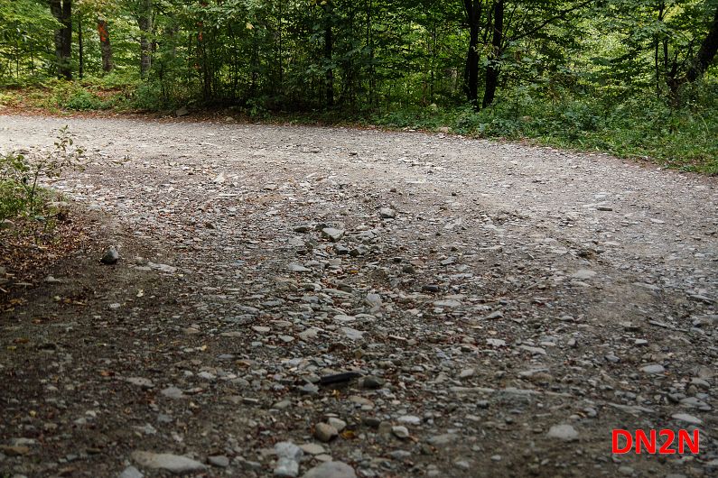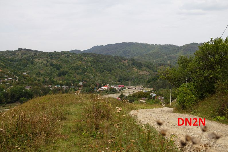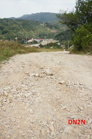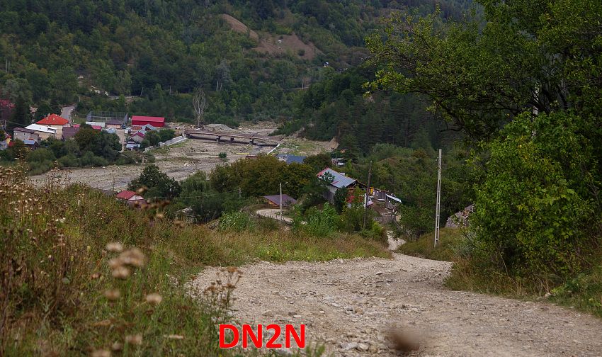 Traversez pe podețul improvizat și încep urcușul pe ceea ce se numeste Drumul Național DN2N. Apa din ultimile ploi a dezgolit bolovanii uriași și dacă ai o mașină mai joasă rămâi cu siguranță fără baia de ulei întreagă. Este un Drum Național pietruit cu bolovani din gârla din apropiere, drum pentru care platim taxe.