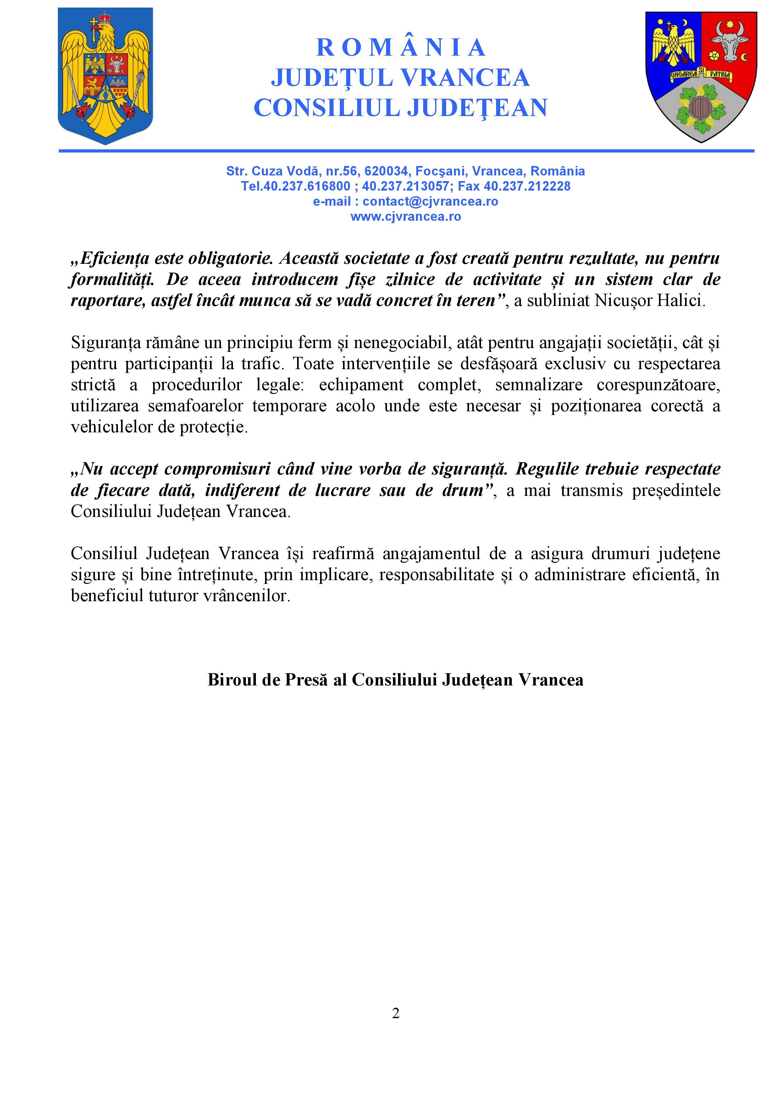 Prin aceste măsuri, Consiliul Județean Vrancea își reafirmă angajamentul de a oferi drumuri județene sigure, bine întreținute și administrate eficient, în beneficiul tuturor locuitorilor județului.