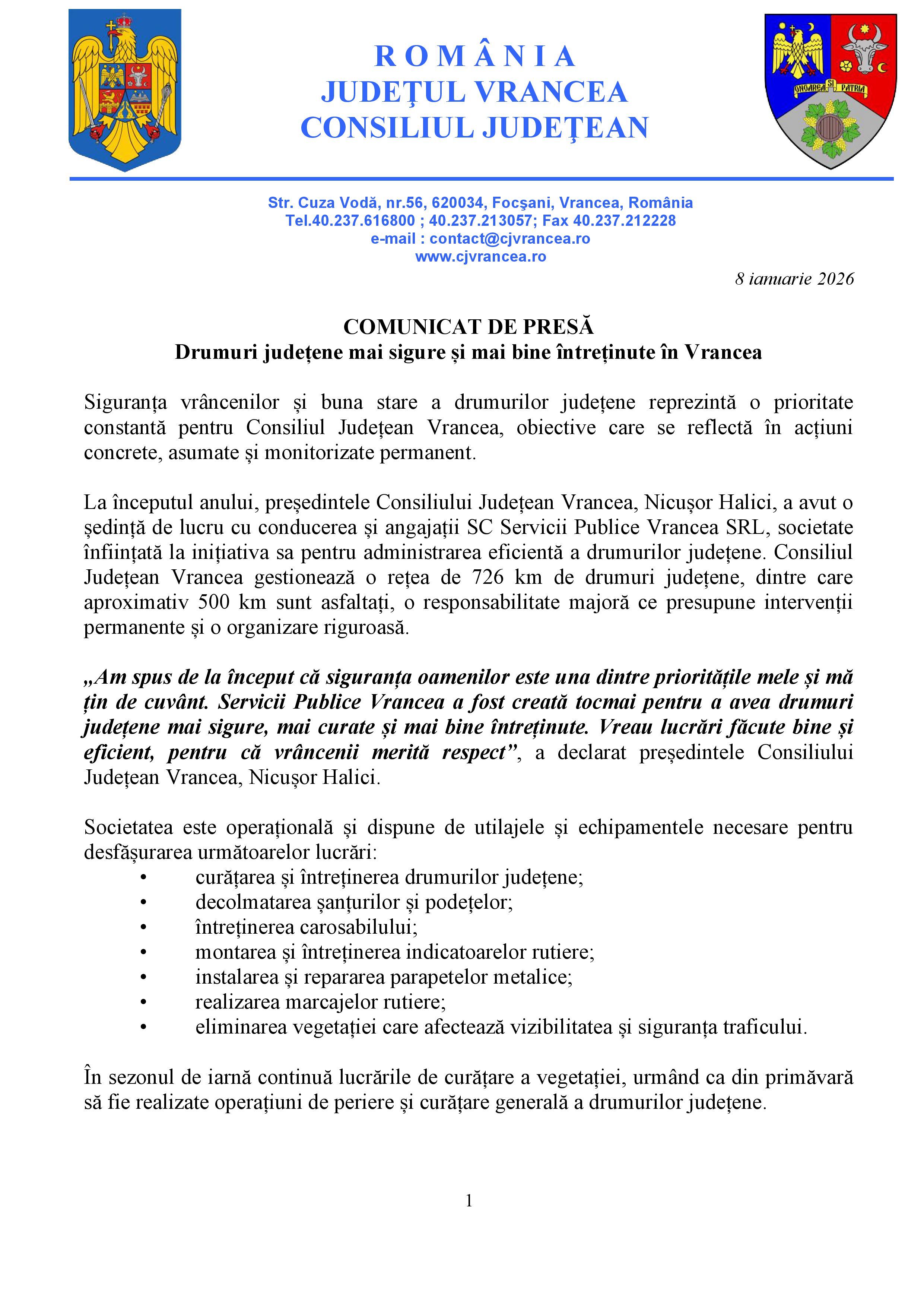 Citiți î]n documentul atașat conținutul integral al comunicatului de presă făcut public joi 8 ianaurie 2026 ora 16:46 de către Biroul de presă al Consiliului Județean Vrancea în legătură cu acestă știre