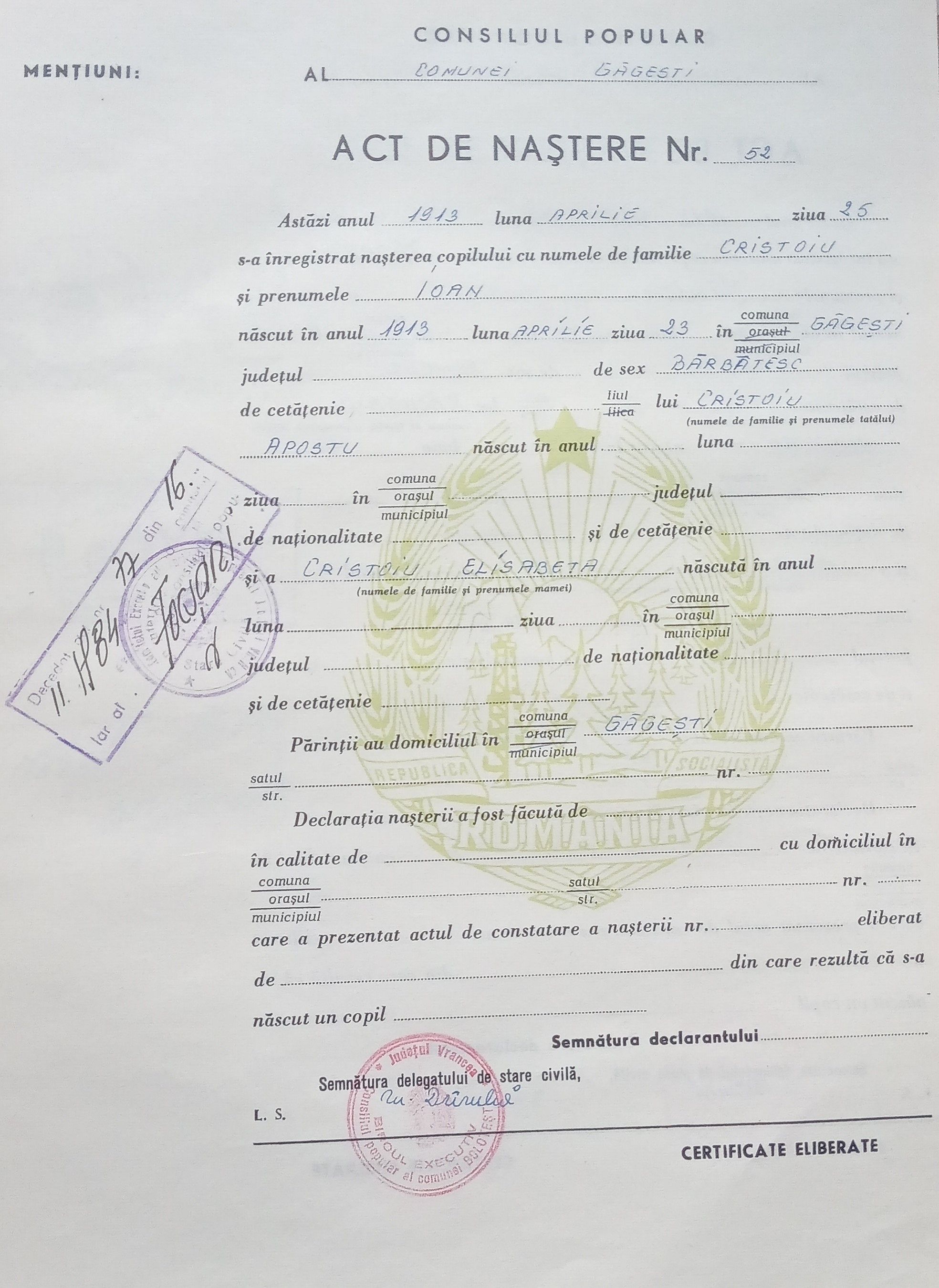 Revenind la maestrul Ion Cristoiu există despre distinsul nostru contemporan câteva indicii în depozitele Arhivelor Naționale Vrancea și cu speranța că nu se va supăra pe lucrătorii din Arhive iată-le, pe scurt, după cum urmează: „ în anul 1913 a venit pe lume Ioan, fiul lui Cristoiu Apostu și Cristoiu Elisabeta.” Suplimentar există pe marginea registrului mențiunea decesului, anume „ mort la Focsani în 1984”. Alte date despre acesta nu mai sunt în respectivul act de stare civilă, deoarece acesta este un document reconstituit mai târziu, pe baza originalului deteriorat. După cum știți și dvs, în zona comunei Bolotesti și Găgești a fost linia frontului în timpul Primului Război Mondial și inamicii României nu au avut niciun fel de respect pentru actele fostei Primării Găgești, distrugându-le fără milă. Așa că mai târziu autoritățile românești au decis să încerce o reconstituire pe baza puținelor dosare salvate și a declarațiilor sătenilor, dorindu-se, în acest fel, legitimarea civilă a localnicilor. Refacerea actelor s-a realizat, cât s-a putut, așa că pe actul de naștere al tatălui maestrului găsim puține date. Dar suficiente.
