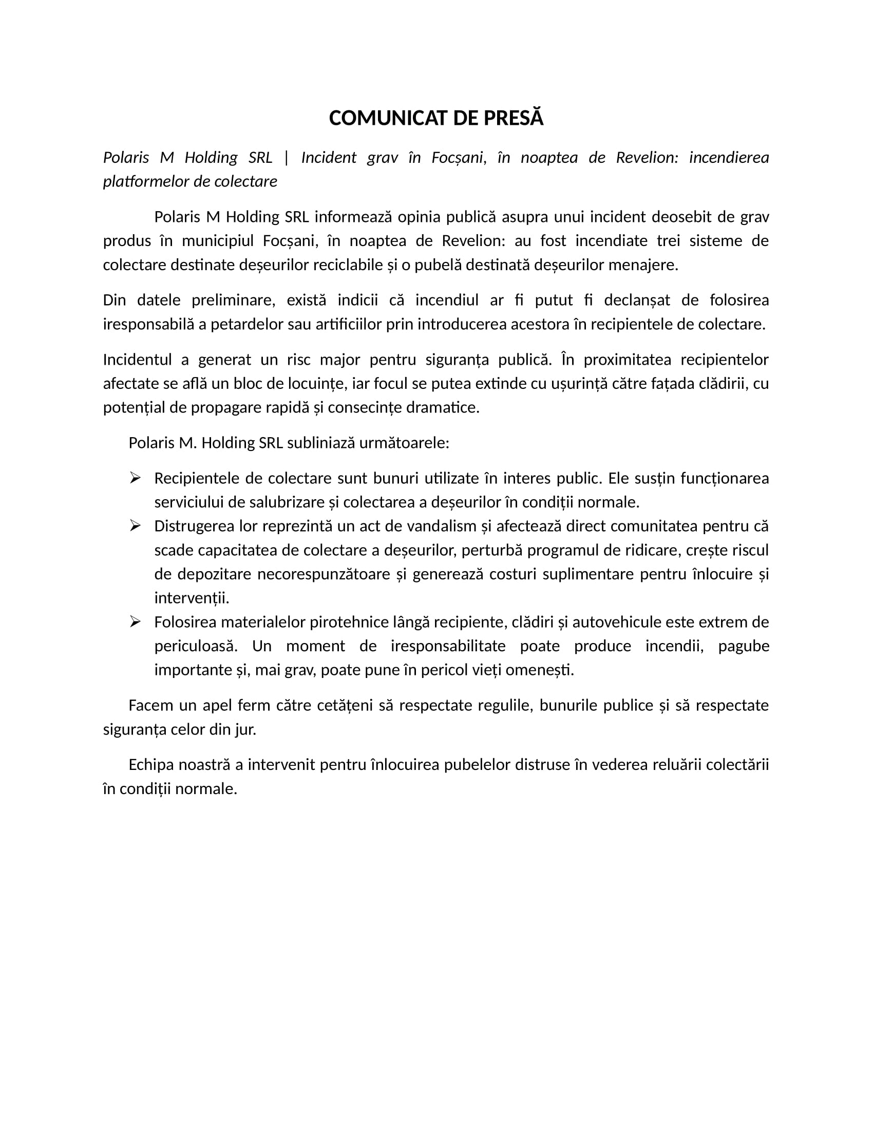 Un incident grav, cu potențial major de risc pentru siguranța publică, a avut loc în municipiul Focșani, în noaptea de Revelion, când mai multe platforme de colectare a deșeurilor au fost incendiate. Informația a fost transmisă redacției Ziarului de Vrancea printr-un comunicat oficial al S.C. Polaris M. Holding S.R.L., operatorul serviciului de salubrizare din județ.