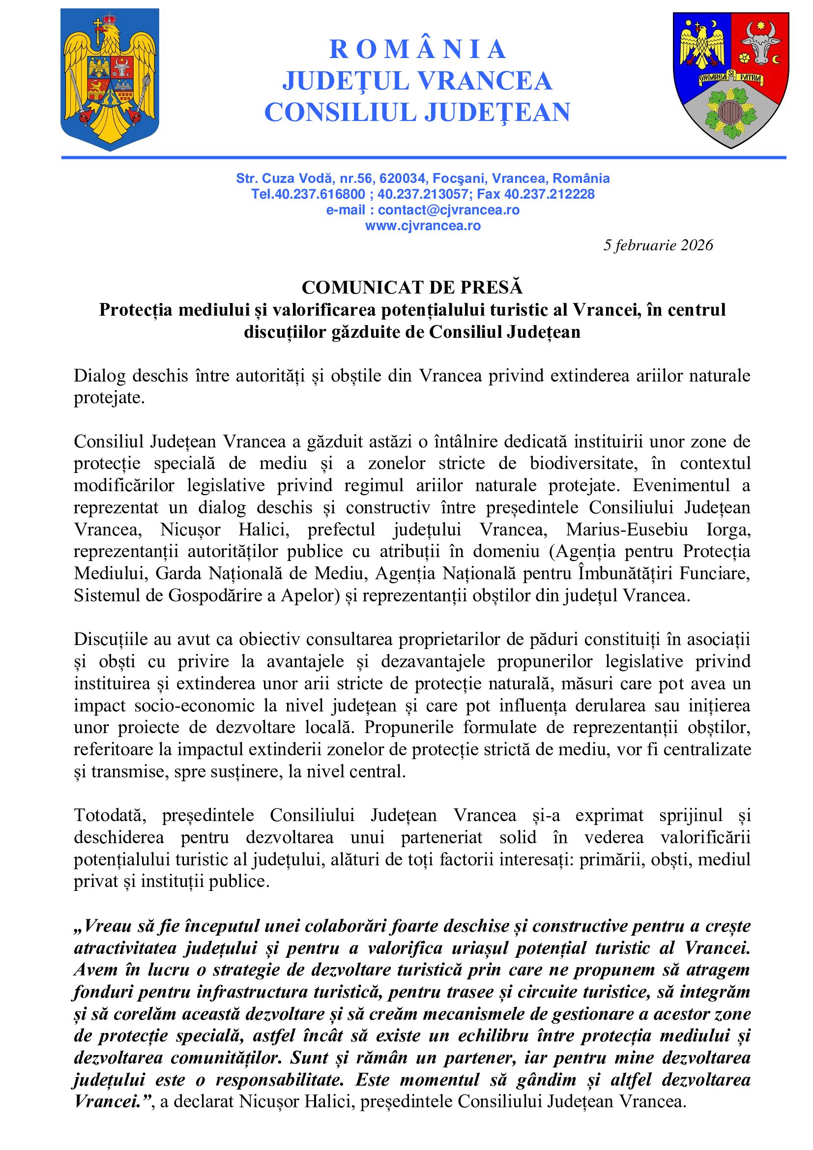 Citiți și conținutul integral al comunicatului de presă făcut public, joi 5 februarie 2026 ora 16:51 de către Biroul de presă al Consiliului Judetean Vrancea în legătură cu această știre