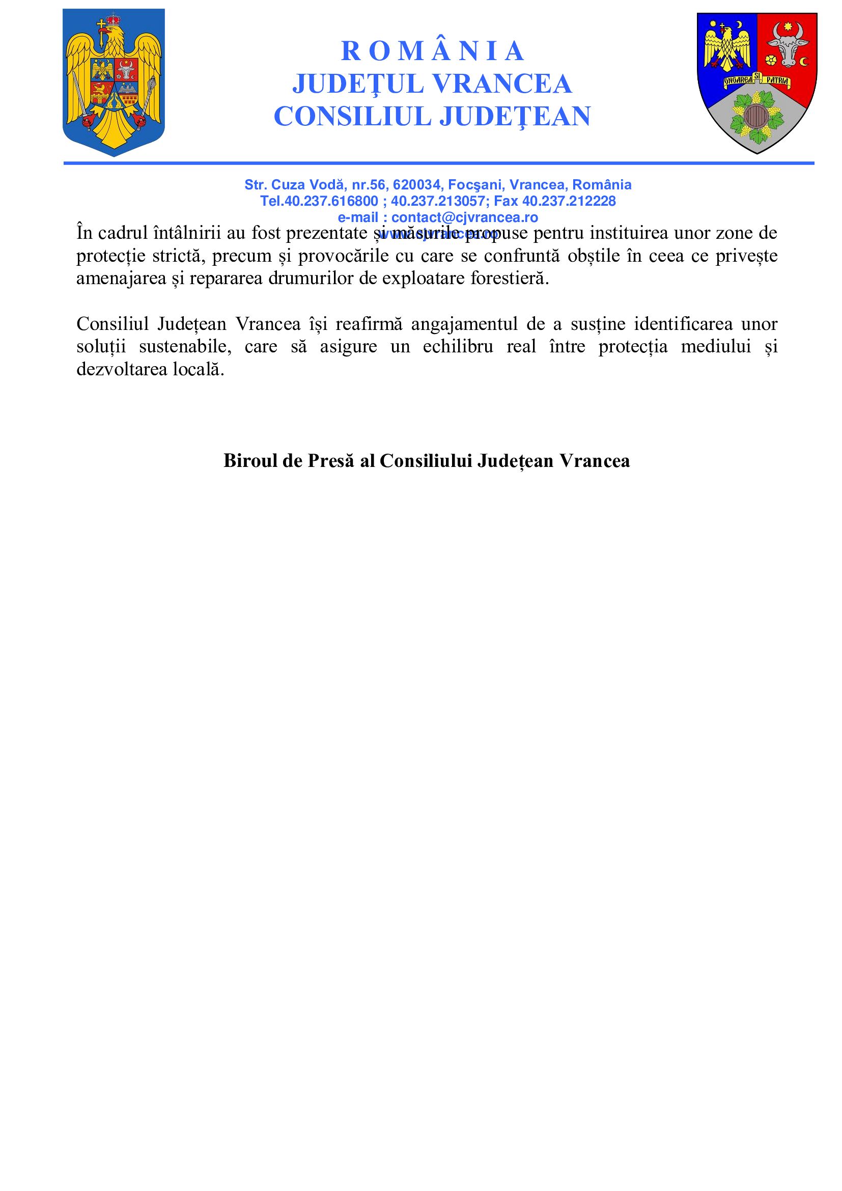 Potrivit unui comunicat de presă transmis de Biroul de presă al Consiliului Județean Vrancea, discuțiile au vizat instituirea unor zone de protecție specială de mediu și a unor zone stricte de biodiversitate, cu impact direct asupra pădurilor aflate în administrarea obștilor din județ.