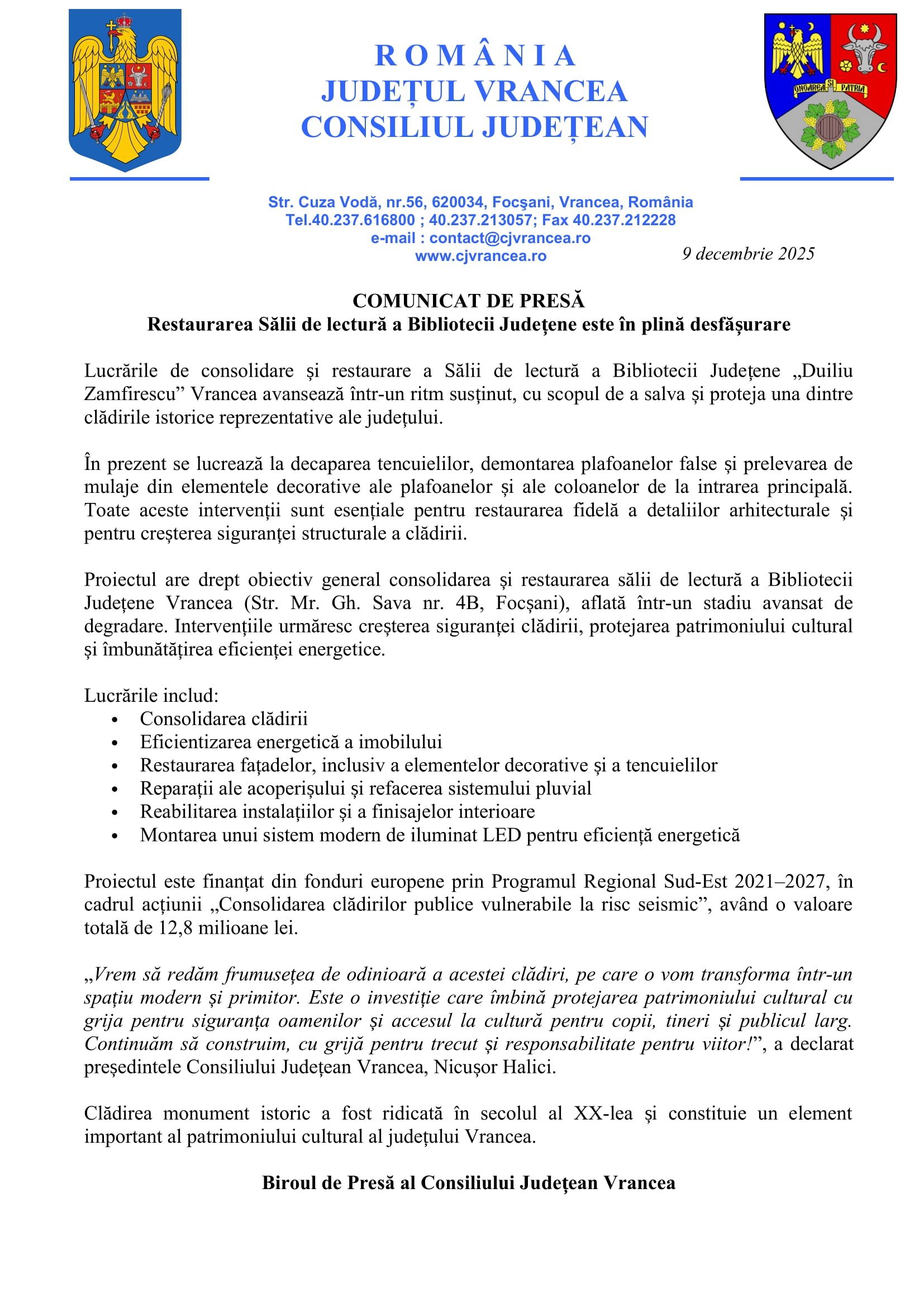 Lucrările de restaurare a Sălii de lectură a Bibliotecii Județene „Duiliu Zamfirescu” Vrancea se află în plină desfășurare, potrivit unui comunicat transmis marți, 9 decembrie 2025, de Biroul de presă al Consiliului Județean Vrancea. Intervențiile au ca obiectiv salvarea uneia dintre clădirile istorice semnificative ale județului, situată pe strada Mr. Gh. Sava nr. 4B din Focșani.