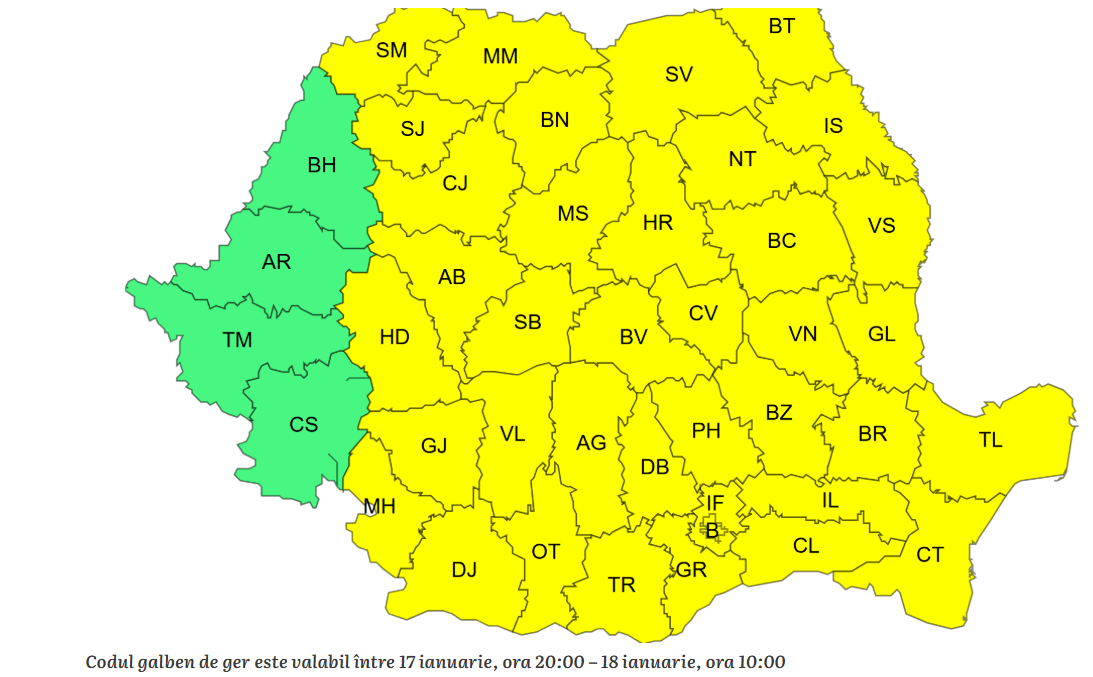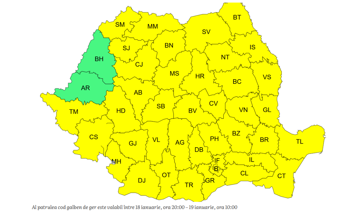 De sâmbătă seară și până duminică dimineață, între 17 ianuarie, ora 20:00 – 18 ianuarie, ora 10:00, a intrat în vigoare al doilea cod galben, cu minime nocturne între -20 și -10 grade, gerul fiind resimțit accentuat în toate zonele județului.