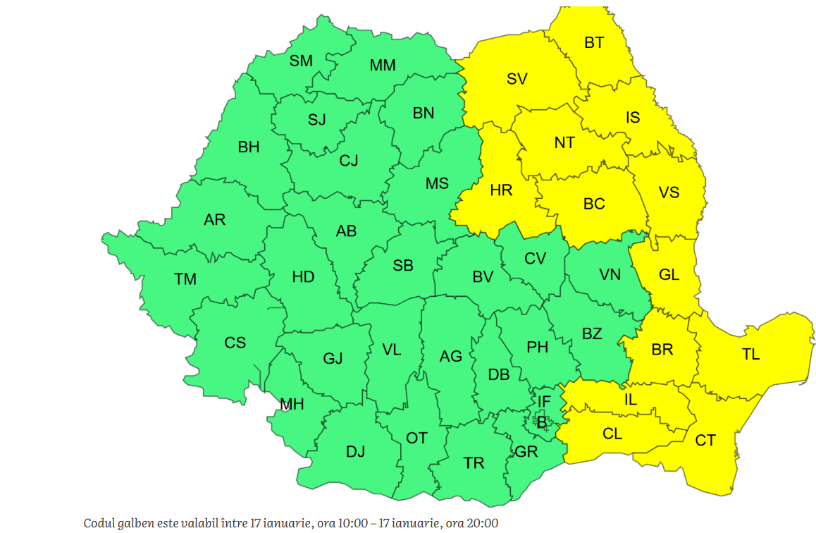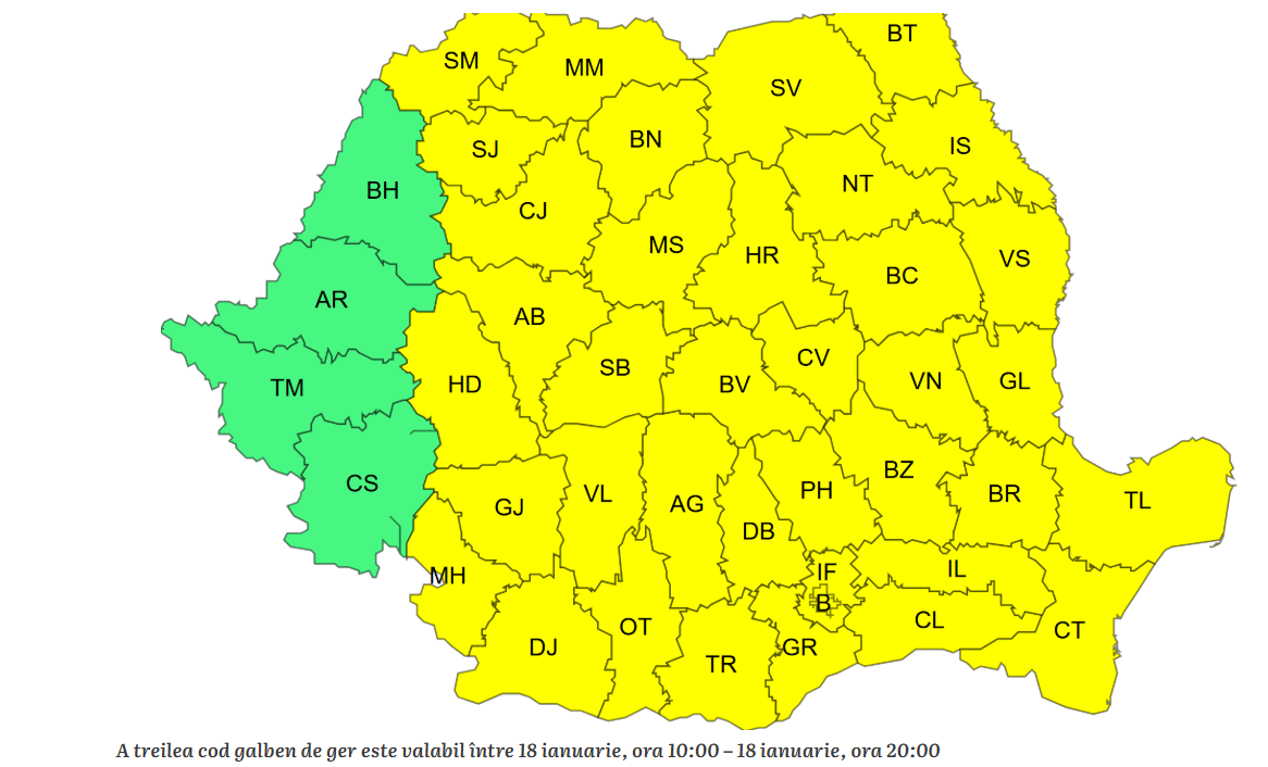Un al treilea cod galben este activ duminică, 18 ianuarie, între orele 10:00 – 20:00, când maximele diurne rămân negative, în general între -9 și -5 grade, iar senzația de frig este amplificată de vânt.
