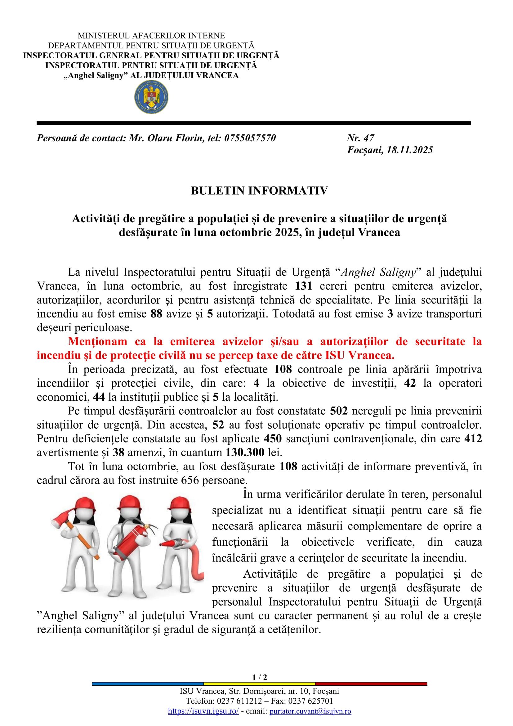 Citiți și conținutul integral al Buletinului Informativ nr 47 din 18 noiembrie 2025, făcut public de Compartimentul Informare și Relații Publice al ISU Vrancea în legătură cu această știre