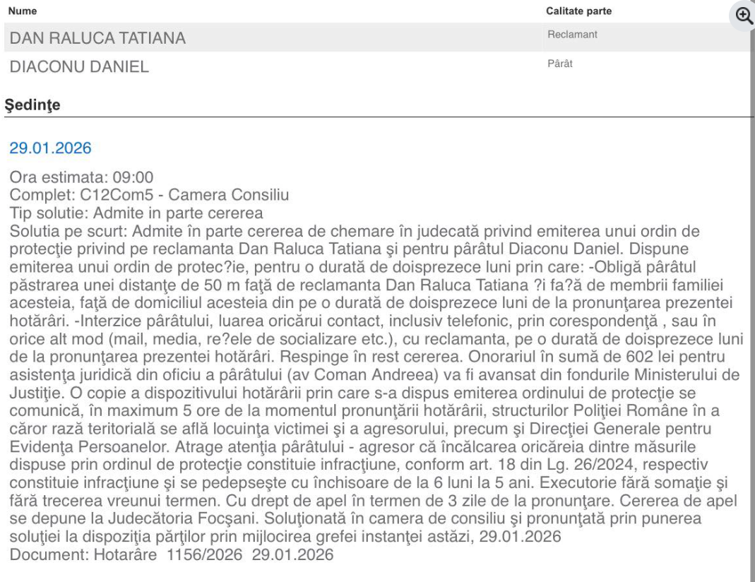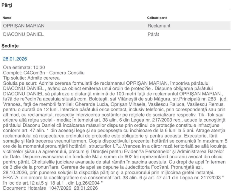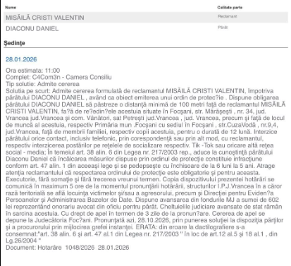 Conform hotărârilor pronunțate în luna ianuarie 2026, bărbatul are interdicția de a se apropia și de a lua legătura, direct sau indirect, cu primarul Municipiului Focșani, Cristi Valentin Misăilă, cu secretarul general al județului Vrancea, Raluca Tatiana Dan, precum și cu fostul președinte al Consiliului Județean Vrancea, Marian Oprișan.