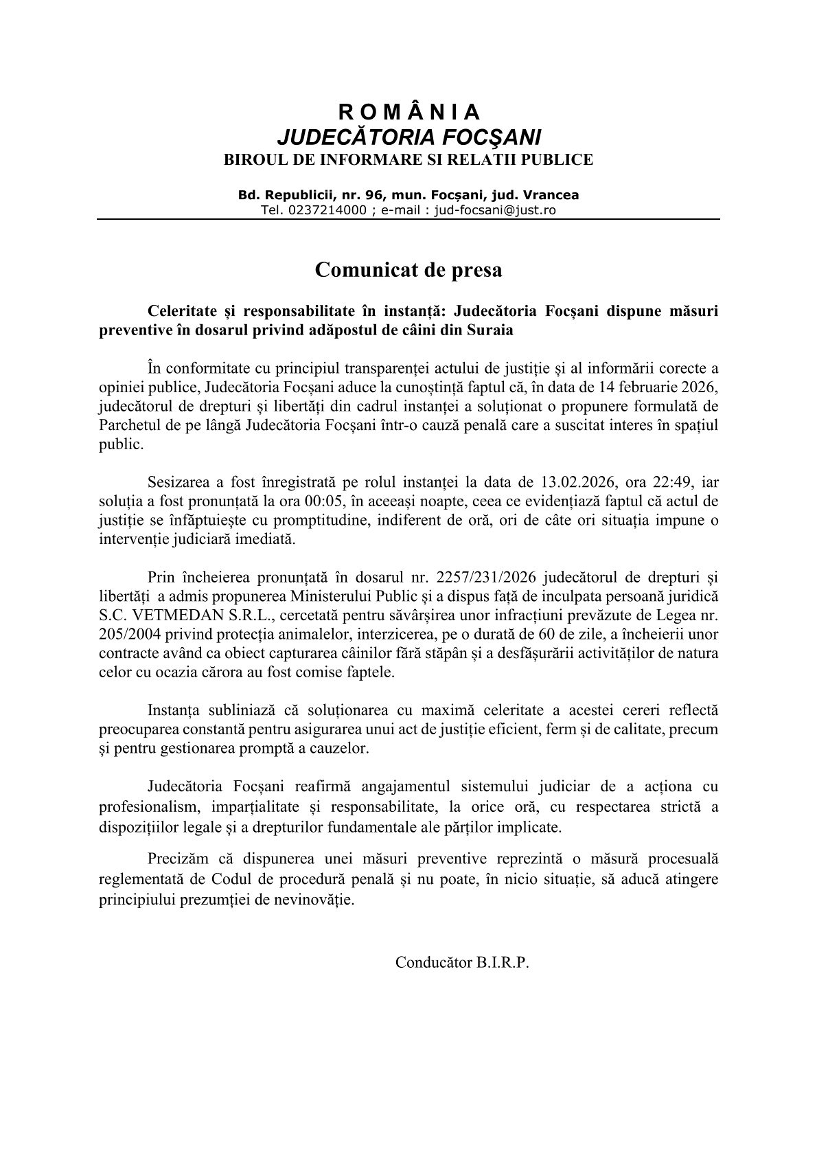 Noi evoluții importante în dosarul care vizează adăpostul privat de câini din comuna Suraia, județul Vrancea. Sâmbătă, 14 februarie 2026, Judecătoria Focșani a anunțat oficial dispunerea unei măsuri preventive împotriva societății Vetmedan SRL, cercetată pentru infracțiuni prevăzute de Legea nr. 205/2004 privind protecția animalelor.
