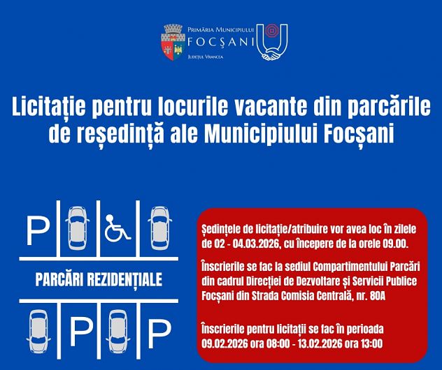 Potrivit informațiilor publicate vineri, 6 februarie 2026, ședințele de licitație se vor desfășura în perioada 2–4 martie 2026, cu începere de la ora 09:00, la sediul Compartimentului Parcări din cadrul DDSP Focșani, situat pe strada Comisia Centrală, nr. 80A.