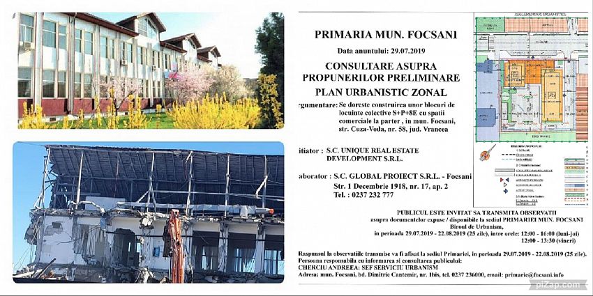 Conform documentelor publice, Primăria Municipiului Focșani a lansat încă din 29 iulie 2019 consultarea asupra propunerilor preliminare ale Planului Urbanistic Zonal pentru construirea de blocuri S+P+8E cu spații comerciale la parter, pe strada Cuza Vodă nr. 58. Inițiatorul proiectului era S.C. Unique Real Estate Development S.R.L., iar elaboratorul tehnic S.C. Global Proiect S.R.L. Focșani.