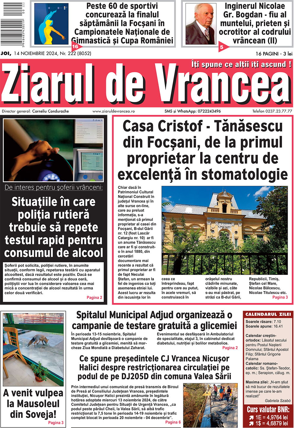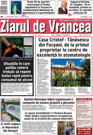 Prima pagină a ediției tipărite a Ziarului de Vrancea de astăzi, joi 14 noiembrie 2024