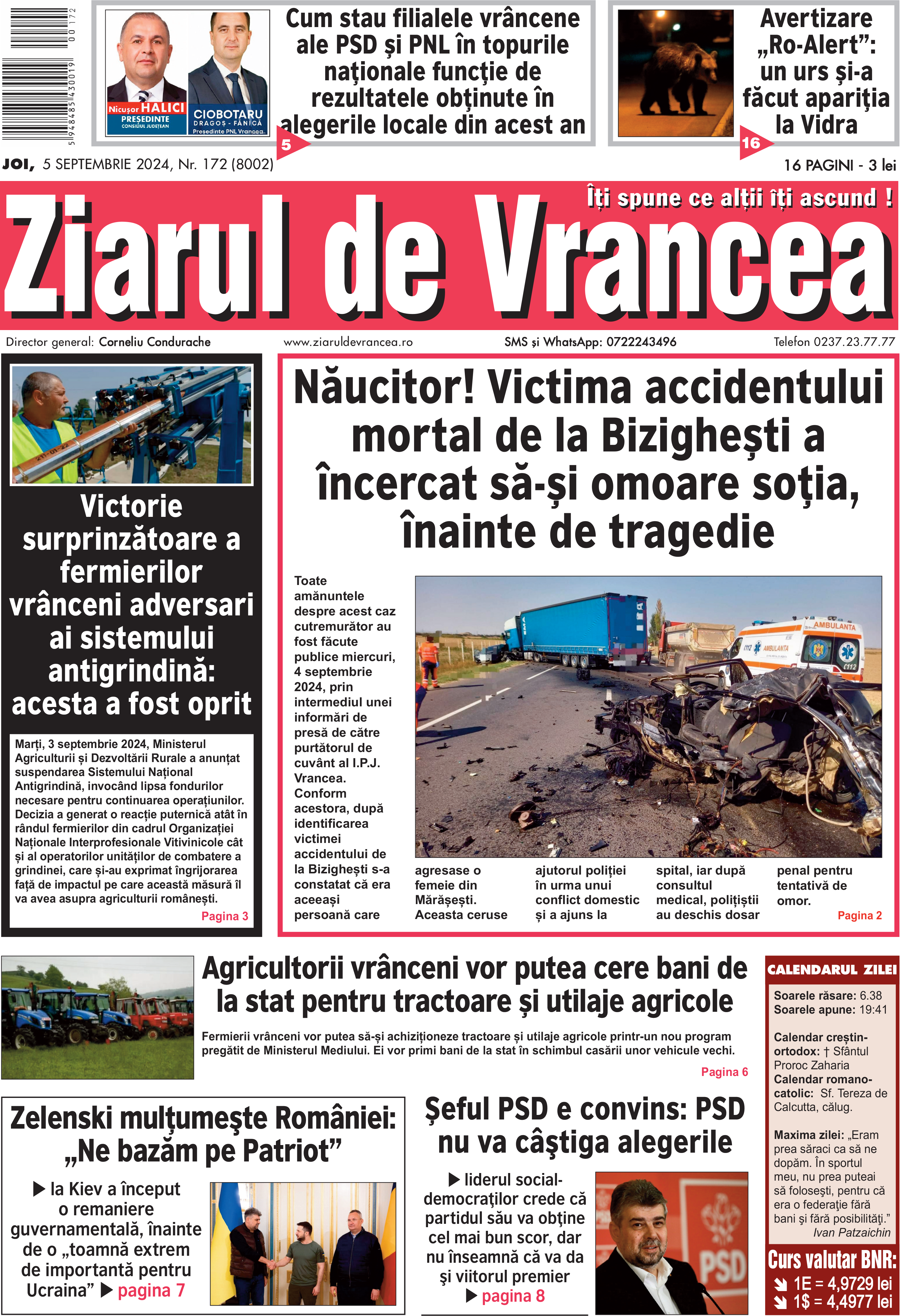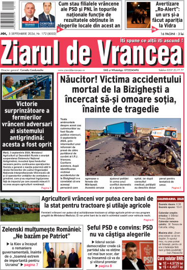 Prima pagină a ediției tipărite a Ziarului de Vrancea de astăzi, joi 5 septembrie 2024
