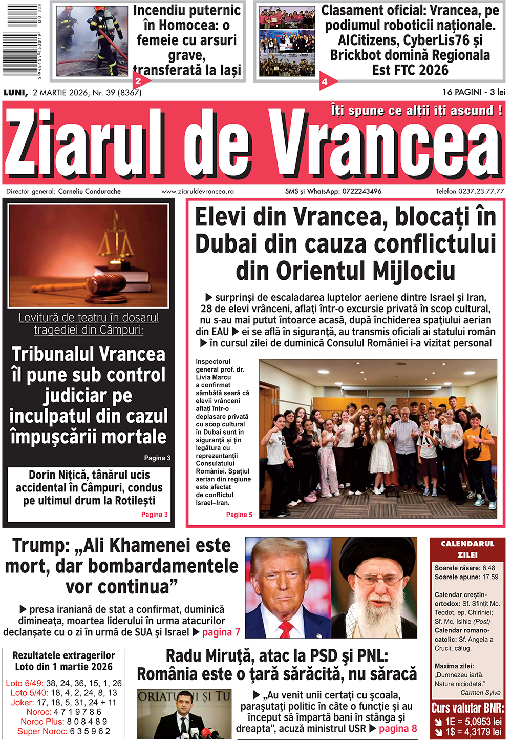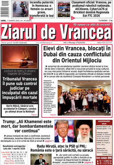 Ediția de luni, 2 martie 2026, a cotidianului Ziarul de Vrancea aduce în prim-plan evenimente cu impact major pentru comunitatea vrânceană, dar și teme de interes național și internațional