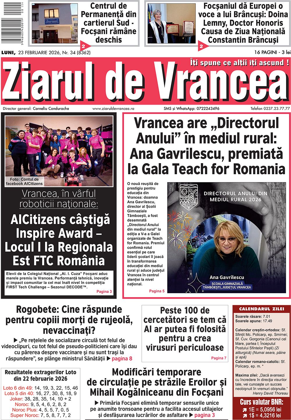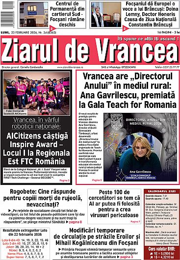 Prima pagină a ediției tipărite a Ziarului de Vrancea de astăzi, luni 23 februarie 2026