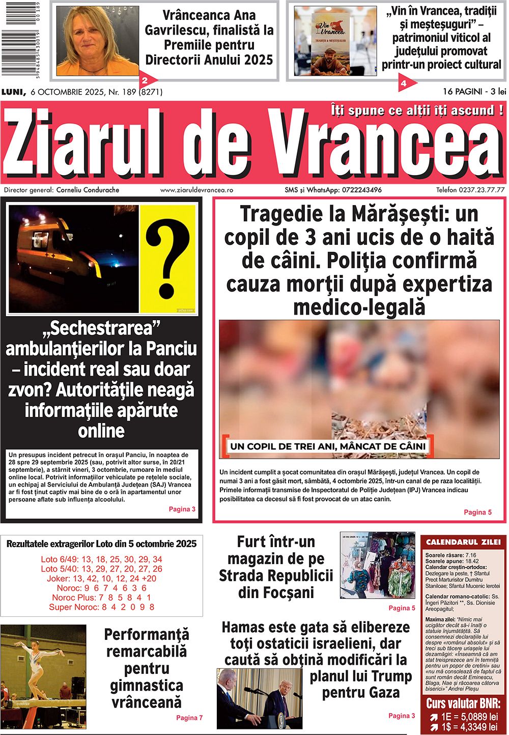 Prima pagină a ediției tipărite a Ziarului de Vrancea de astăzi, luni 6 octombrie 2025