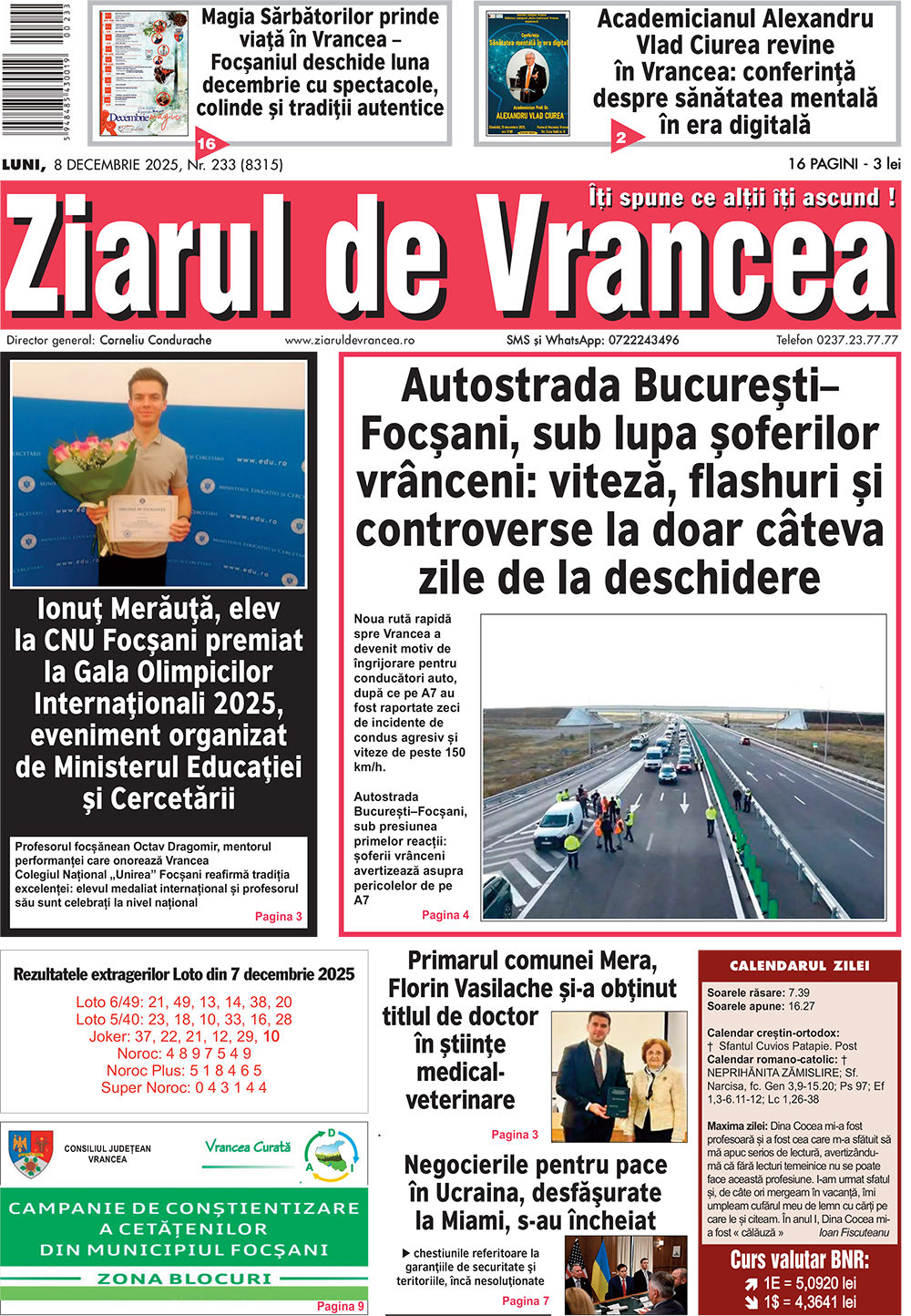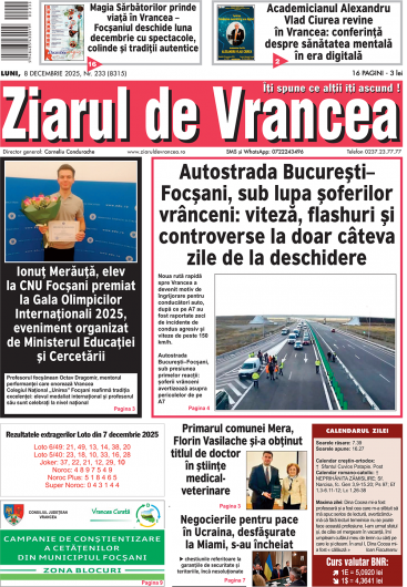 Prima pagină a ediției tipărite a Ziarului de Vrancea de astăzi, luni 8 decembrie 2025
