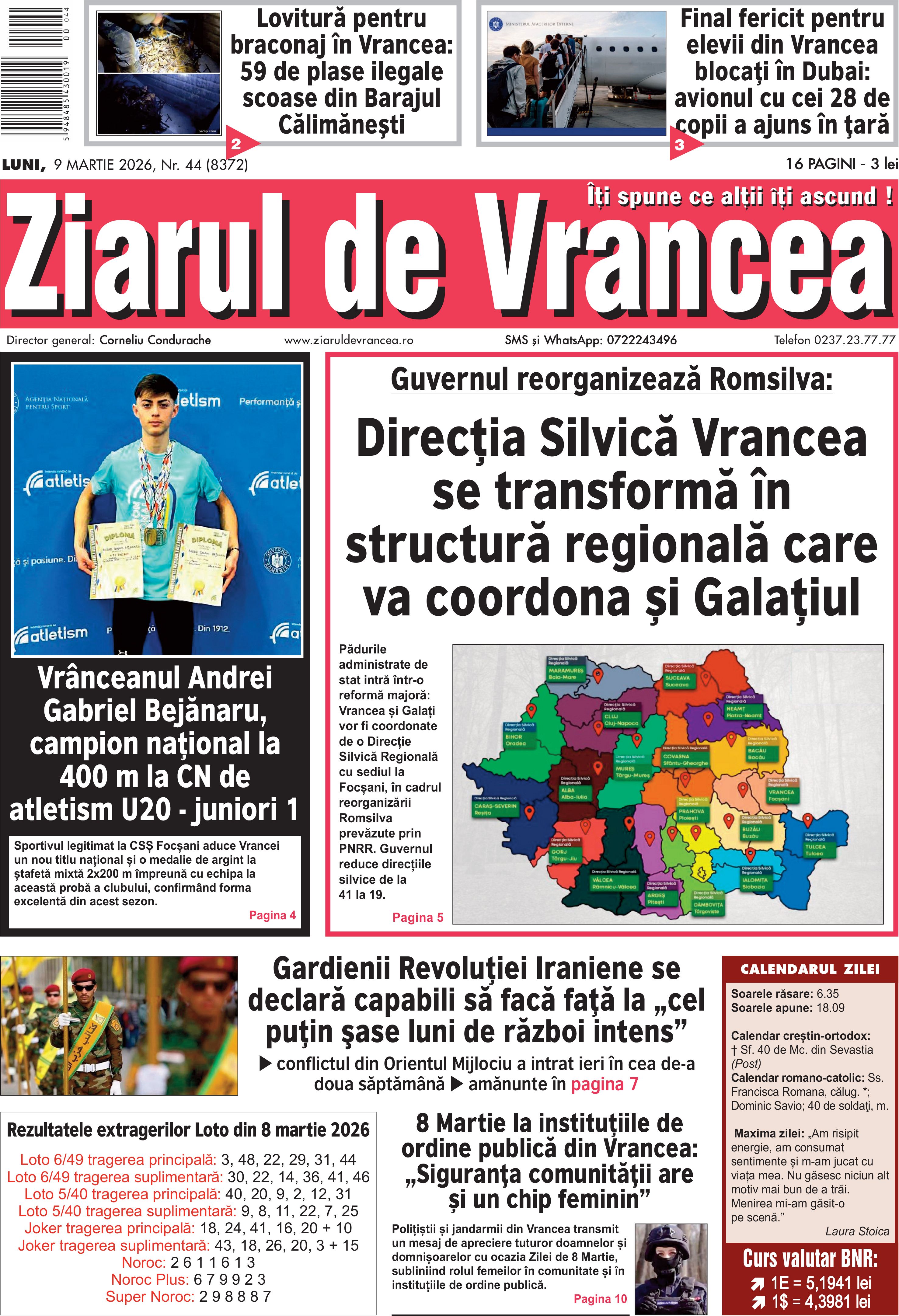 Ziua de 9 martie 2026 aduce în atenția cititorilor „Ziarului de Vrancea” o combinație de actualitate locală, performanță sportivă și evenimente cu impact național. De la titlul de campion național obținut de atletul vrâncean Andrei Gabriel Bejănaru, până la reorganizarea sistemului silvic din România și acțiunile împotriva braconajului din județul Vrancea, prima pagină a ediției tipărite reflectă teme importante pentru comunitate și pentru întreaga țară.