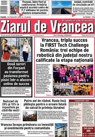 Prima pagină a ediției tipărite a Ziarului de Vrancea de astăzi, marți 24 februarie 2026