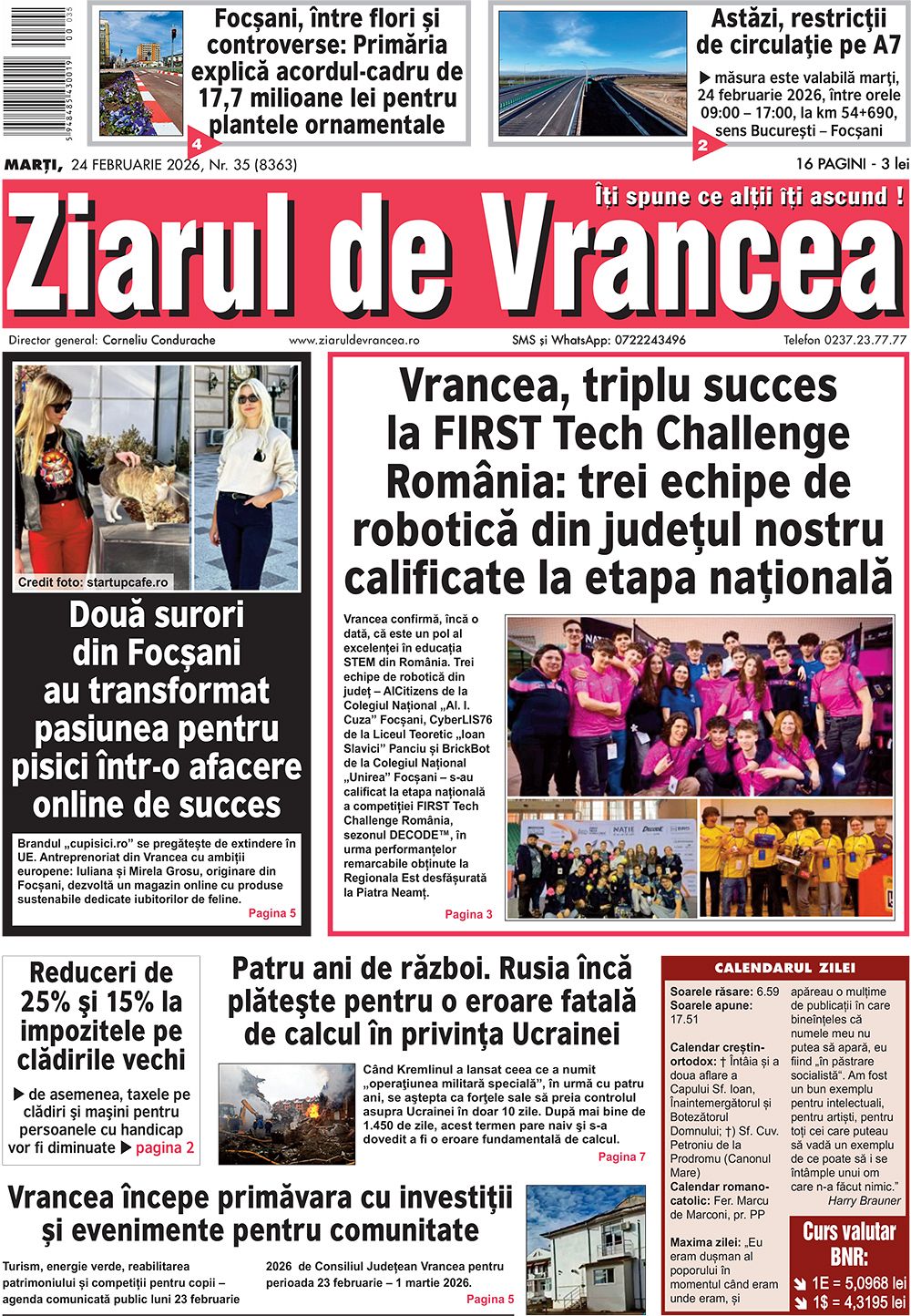 Ediția print Ziarul de Vrancea din 24 februarie 2026 aduce pe prima pagină succesul echipelor FTC, controversele privind acordul pentru plante ornamentale și restricțiile pe Autostrada A7
