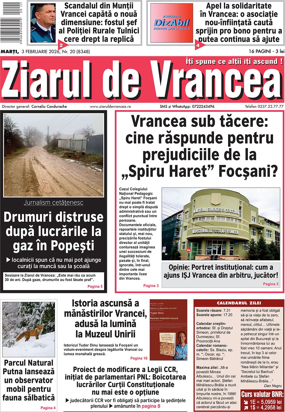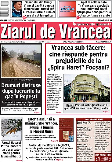 Prima pagină a ediției tipărite a Ziarului de Vrancea de astăzi, marți 3 februarie 2026