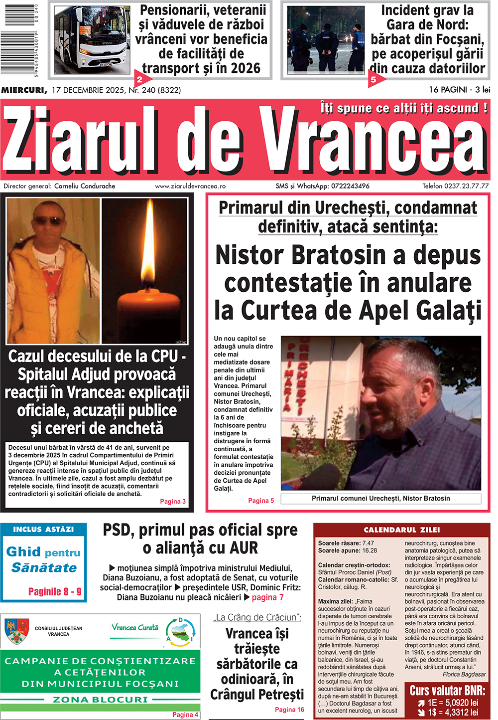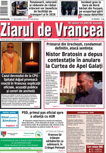 Toate aceste subiecte, alături de alte informații relevante, analize și opinii, pot fi citite în ediția tipărită a Ziarului de Vrancea de astăzi, miercuri, 17 decembrie 2025