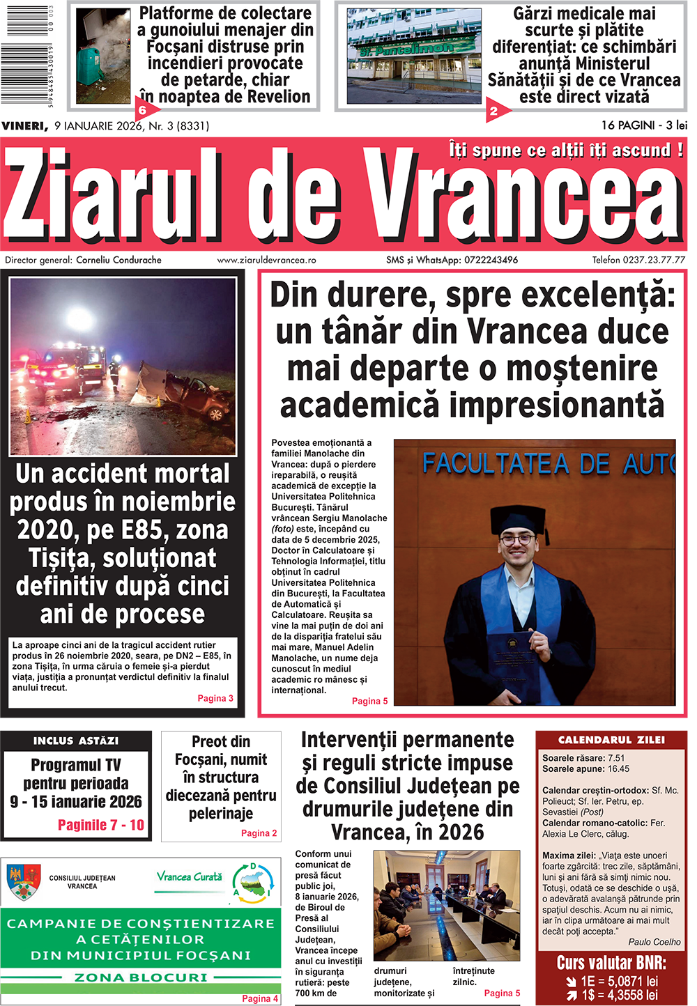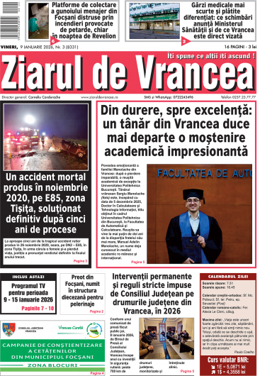 Ziarului de Vrancea aduce în prim-plan cele mai importante subiecte locale din județ, în ediția 9-11 ianuarie 2025: siguranță rutieră, sănătate publică, infrastructură, educație și realitatea de zi cu zi a comunității vrâncene.