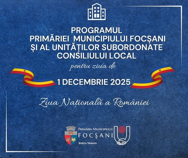 Cu prilejul Zilei Naționale a României, Primăria Municipiului Focșani anunță programul de funcționare al instituțiilor și serviciilor publice aflate în subordinea Consiliului Local pentru data de 1 decembrie 2025. Majoritatea instituțiilor vor avea program întrerupt, fiind zi nelucrătoare, însă anumite servicii esențiale vor asigura permanența sau activitatea minimă necesară pentru buna desfășurare a serviciilor către cetățeni.