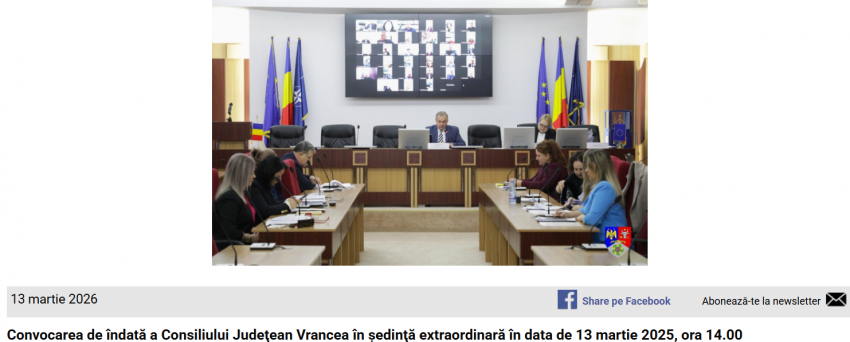 Consiliul Județean Vrancea a fost convocat de îndată în ședință extraordinară vineri, 13 martie 2026, de la ora 14.00, conform unei informări de presă transmise redacției Ziarul de Vrancea de către Biroul de presă al instituției.