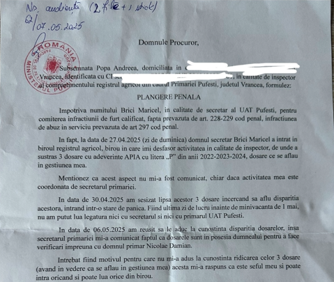 Potrivit documentelor transmise către Parchetul de pe lângă Judecătoria Adjud, Popa Andreea reclamă faptul că secretarul ar fi pătruns în biroul Registrului Agricol fără autorizație, însoțit de primar, luând dosare care conțineau date oficiale. În plângerea înregistrată la Parchet la data de 7 mai 2025, angajata susține că „dosarele au fost luate din birou pentru a fi modificate în scopul denigrării sale și al soțului său”, în contextul unei licitații publice privind un teren agricol.