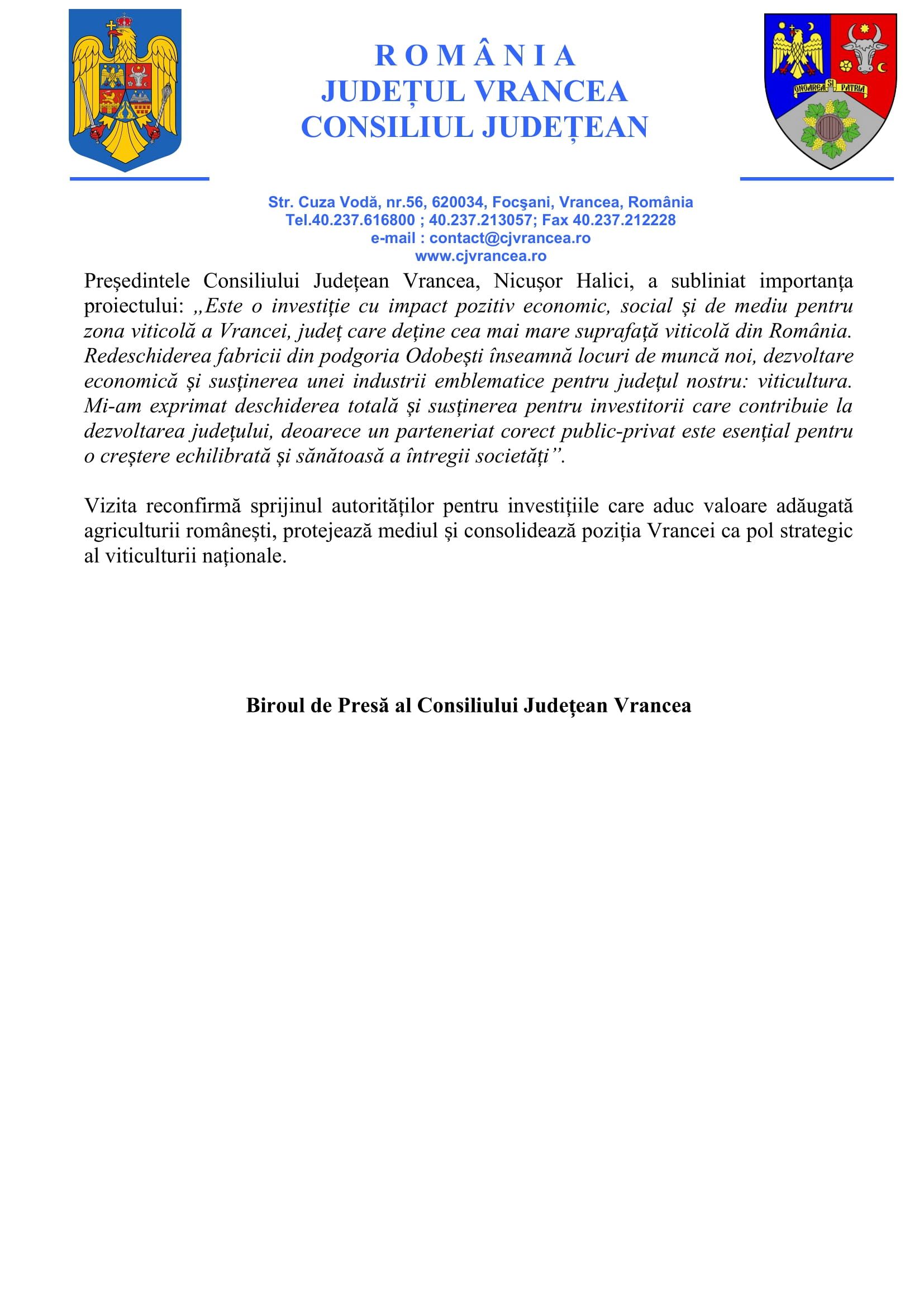 „Este o investiție cu impact economic, social și de mediu pentru zona viticolă a Vrancei, județ care deține cea mai mare suprafață viticolă din România. Redeschiderea fabricii din Odobești înseamnă locuri de muncă noi, dezvoltare economică și susținerea unei industrii emblematice pentru județul nostru: viticultura.”