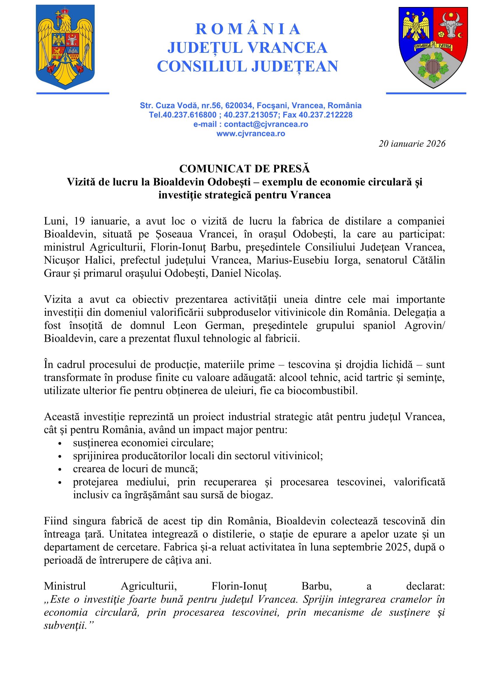 Potrivit unui comunicat de presă transmis marți, 20 ianuarie 2026, la ora 09:30, redacției Ziarului de Vrancea de către Biroul de Presă al Consiliului Județean Vrancea, luni, 19 ianuarie, a avut loc o vizită de lucru la unitatea de distilare situată pe Șoseaua Vrancei, în orașul Odobești.