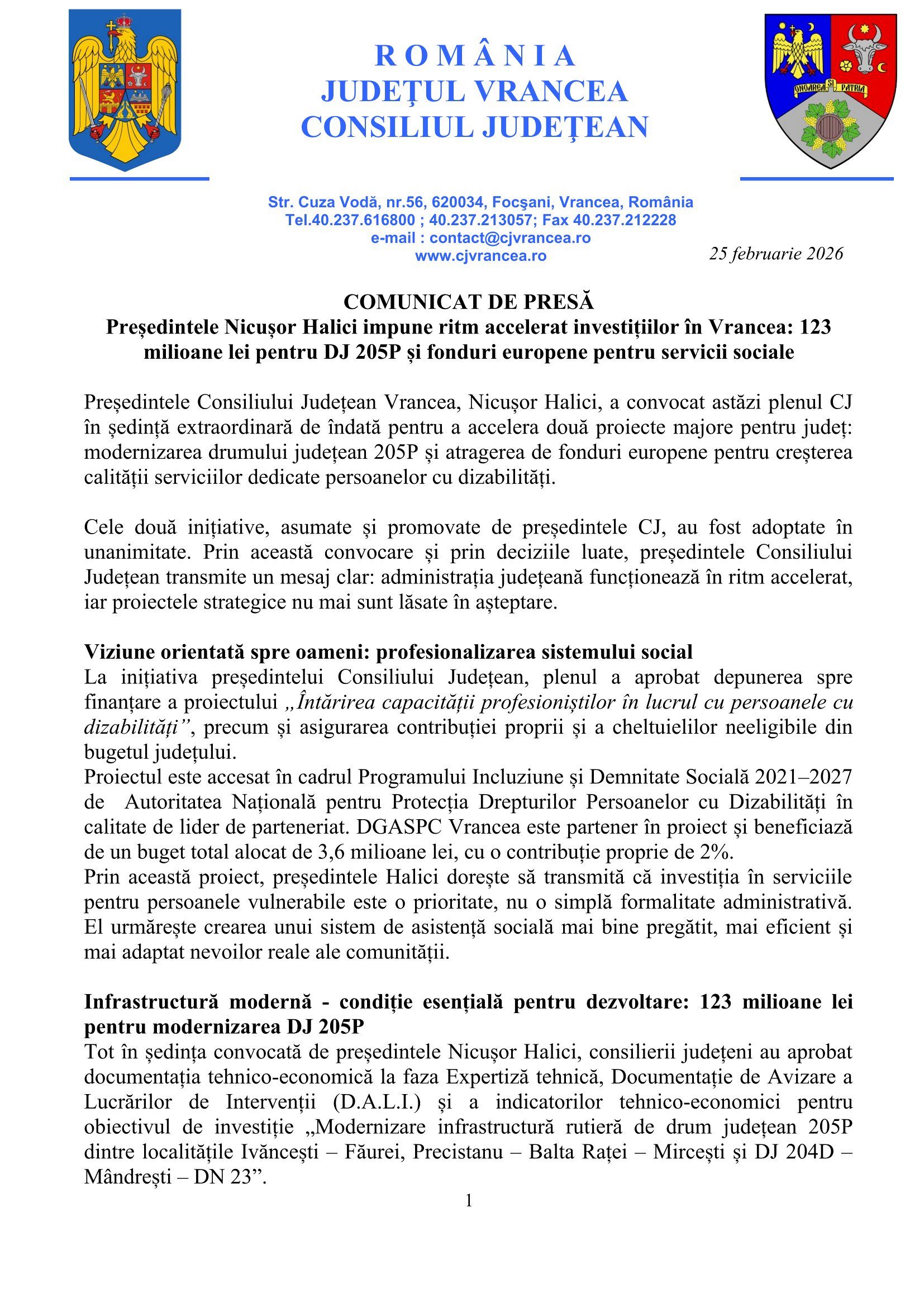 123 milioane lei pentru DJ 205P și 3,6 milioane lei pentru servicii sociale dedicate persoanelor cu dizabilități.Președintele Consiliului Județean Vrancea, Nicușor Halici a convocat, miercuri 25 februarie 2026 o ședință extraordinară și a obținut un vot unanim pentru modernizarea infrastructurii rutiere și atragerea de fonduri europene în județul Vrancea