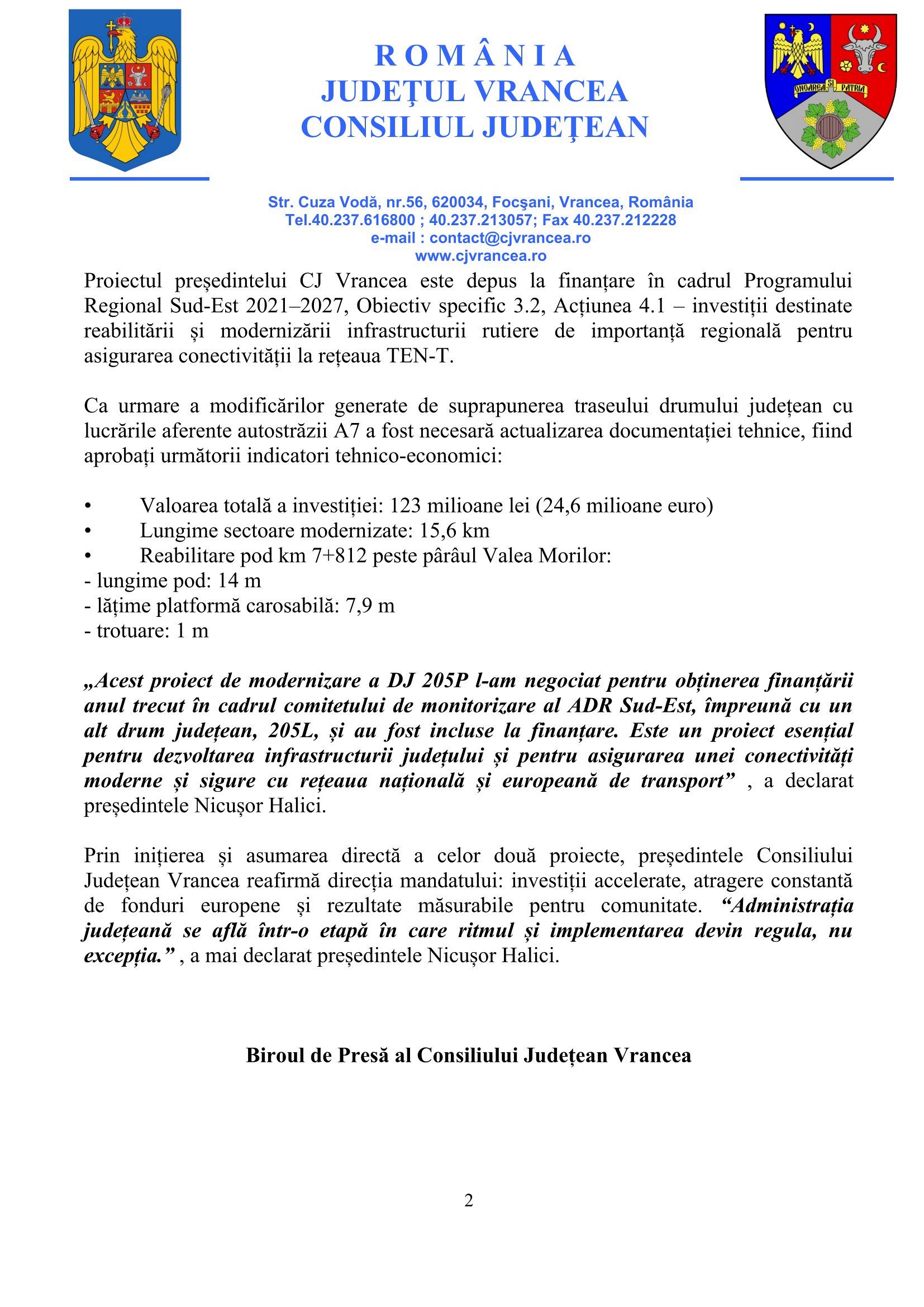 „Acest proiect de modernizare a DJ 205P l-am negociat pentru obținerea finanțării anul trecut în cadrul comitetului de monitorizare al ADR Sud-Est, împreună cu un alt drum județean, 205L, și au fost incluse la finanțare. Este un proiect esențial pentru dezvoltarea infrastructurii județului și pentru asigurarea unei conectivități moderne și sigure cu rețeaua națională și europeană de transport”, a declarat președintele Nicușor Halici.