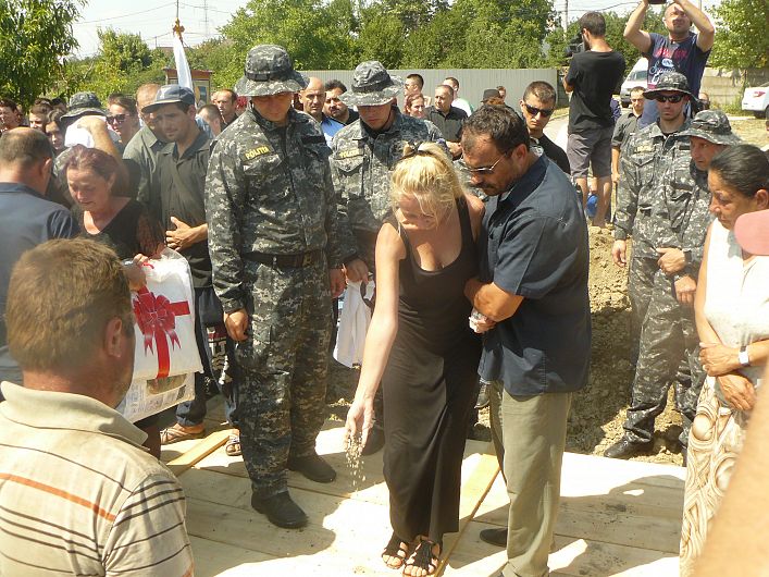 Cortegiul a ajuns pentru câteva minute şi la locuinţa ofiţerului, unde vecinii şi-au luat rămas bun de la Tomiţă. În jurul orelor 14.30, sicriul, purtat pe braţe de lucrători de la Acţiuni Speciale a fost coborât în groapă. Cele două fiice au dorit să-şi ia rămas bun de la tatăl lor, Mariana aruncând primele bucăţi de pământ în groapă. Jandarmii prezenţi la eveniment au executat mai multe focuri de armă în memoria celor care a fost Tomiţă Lazăr. Ofiţerul a murit duminca trecută, după ce a fost înghiţit de apele Siretului în încercarea de a o salva de la înec pe fiica cea mică. Trisitul eveniment de sâmbătă a avut loc chiar în ziua în care fata cea mare a ofiţerului trebuia să fie mireasă. Drum drum spre ceruri, Tomiţă Lazăr, să-ţi fie ţărina uşoară! (Dan CHIRIAC)