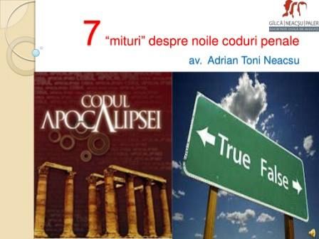 „7 mituri despre noile coduri penale”, astfel şi-a intitulat avocatul Adrian Toni Neacşu prezentarea pe care a făcut-o vineri, la invitaţia IRL Vrancea, menită să fie o dezbatere despre noile Coduri în materie penală. „Eu o să vă propun în această după amiază să avem o altfel de abordare despre noile coduri” a declarat în debut, la un mod mai puţin oficial şi relaxat, fostul preşedinte al Tribunalului. Discursul său a fost centrat pe faptul că, în ultima săptămană din ianuarie, chiar înainte de intrarea în vigoare a noilor Coduri, la nivel naţional a existat o isterie legată de minusurile pe care le-ar avea aplicarea acestora. „Cu cateva zile înainte de intrarea în vigoare a izbucnit un adevărat scandal mediatic, cu privire la ceea ce avea să se întample după intrarea în vigoare a noilor coduri. Era un adevărat dezastru adus de cele două coduri”, a mai spus avocatul Neacşu.